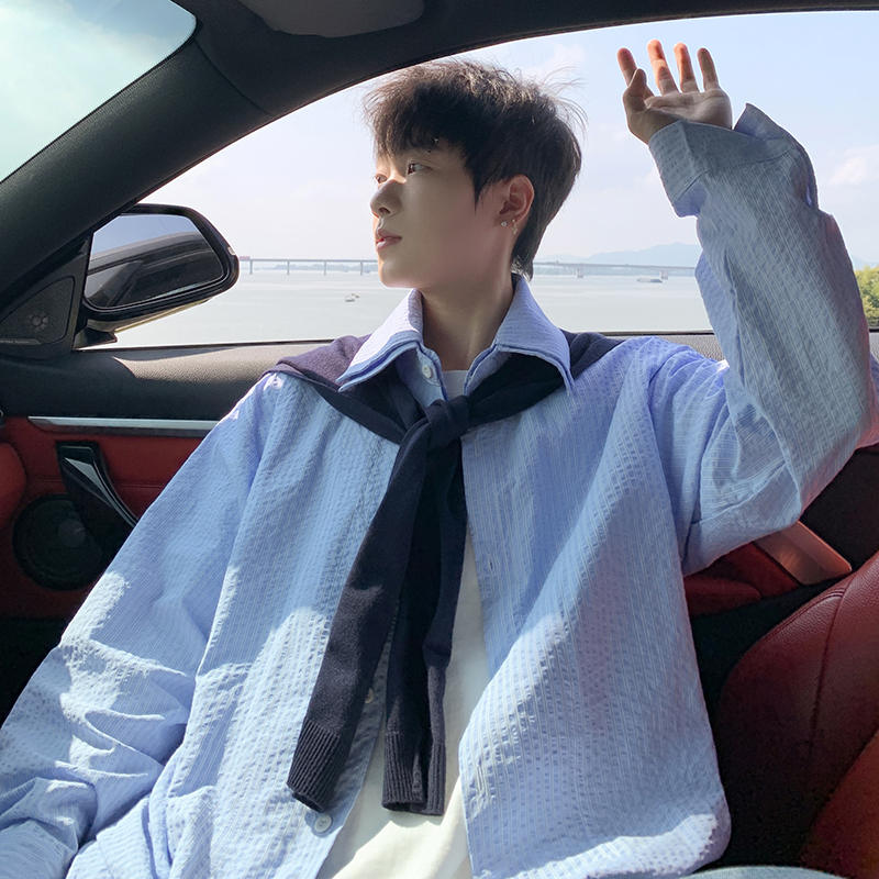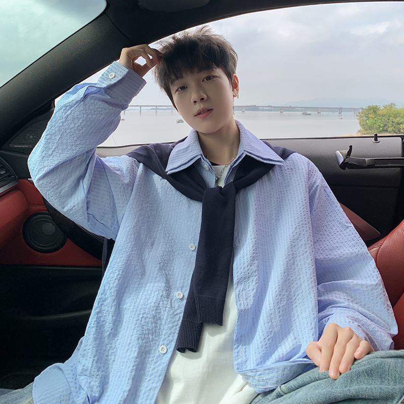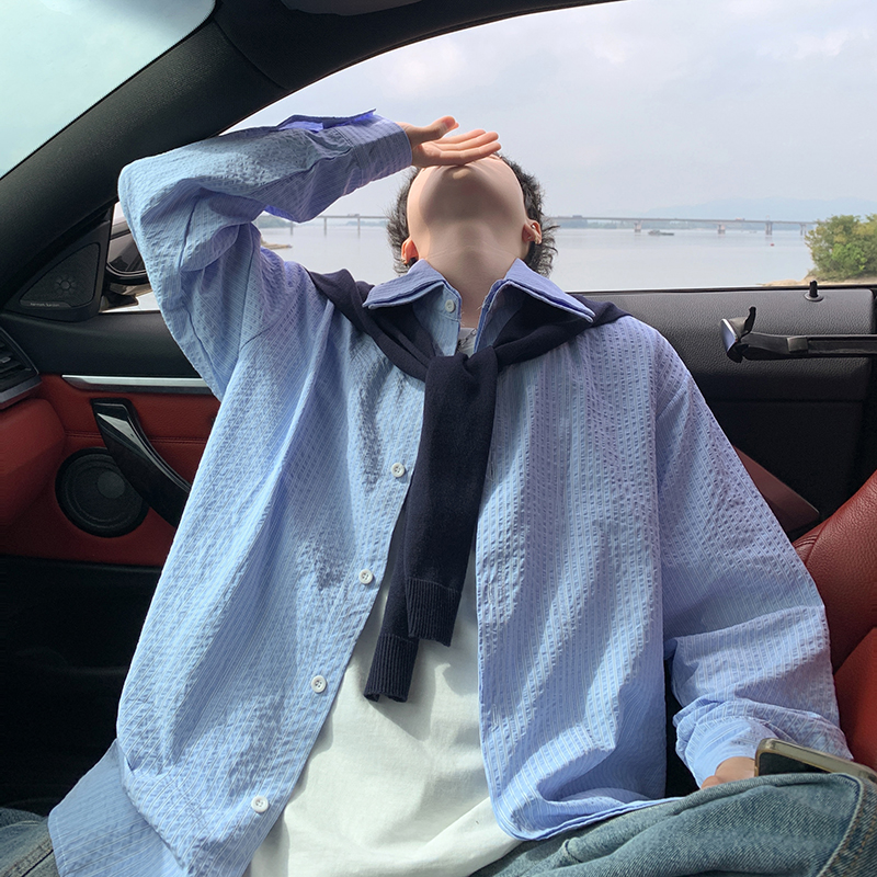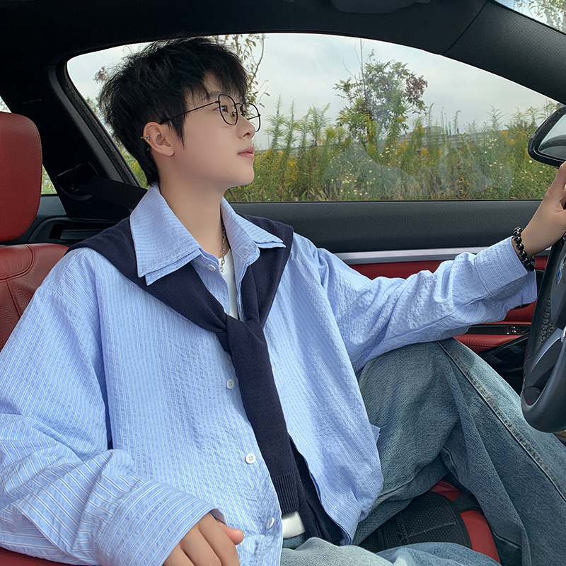 长袖衬衫男女针织披肩假两件蓝色衬衣秋冬设计感条纹休闲翻领外套