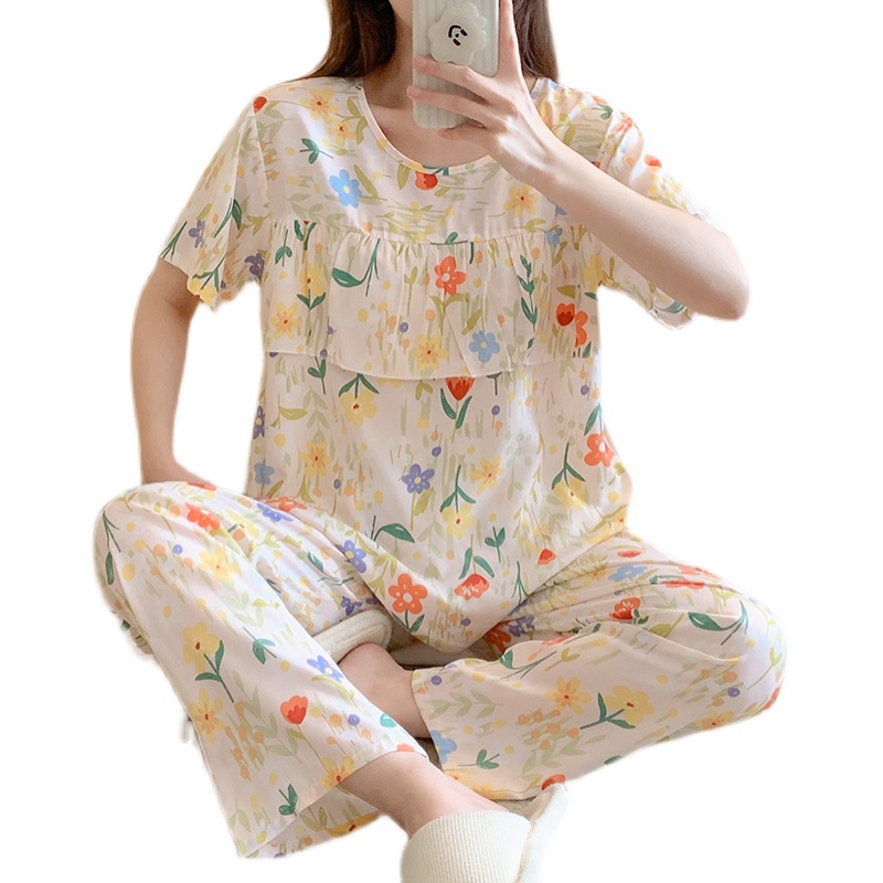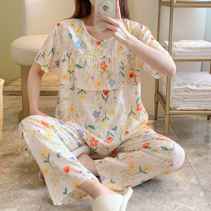 防凸点睡衣女士夏季超薄款棉绸夏天短袖长裤荷叶边套装家居服学生