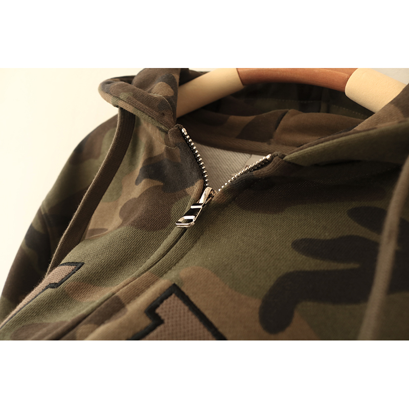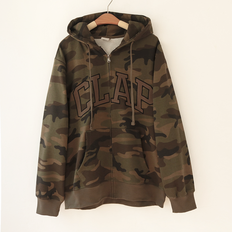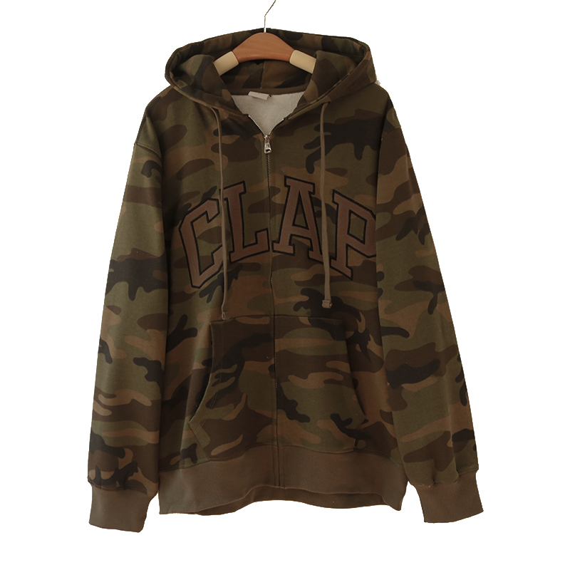 欧美风春秋迷彩上衣连帽卫衣情侣款休闲宽松毛圈棉大码开衫外套女