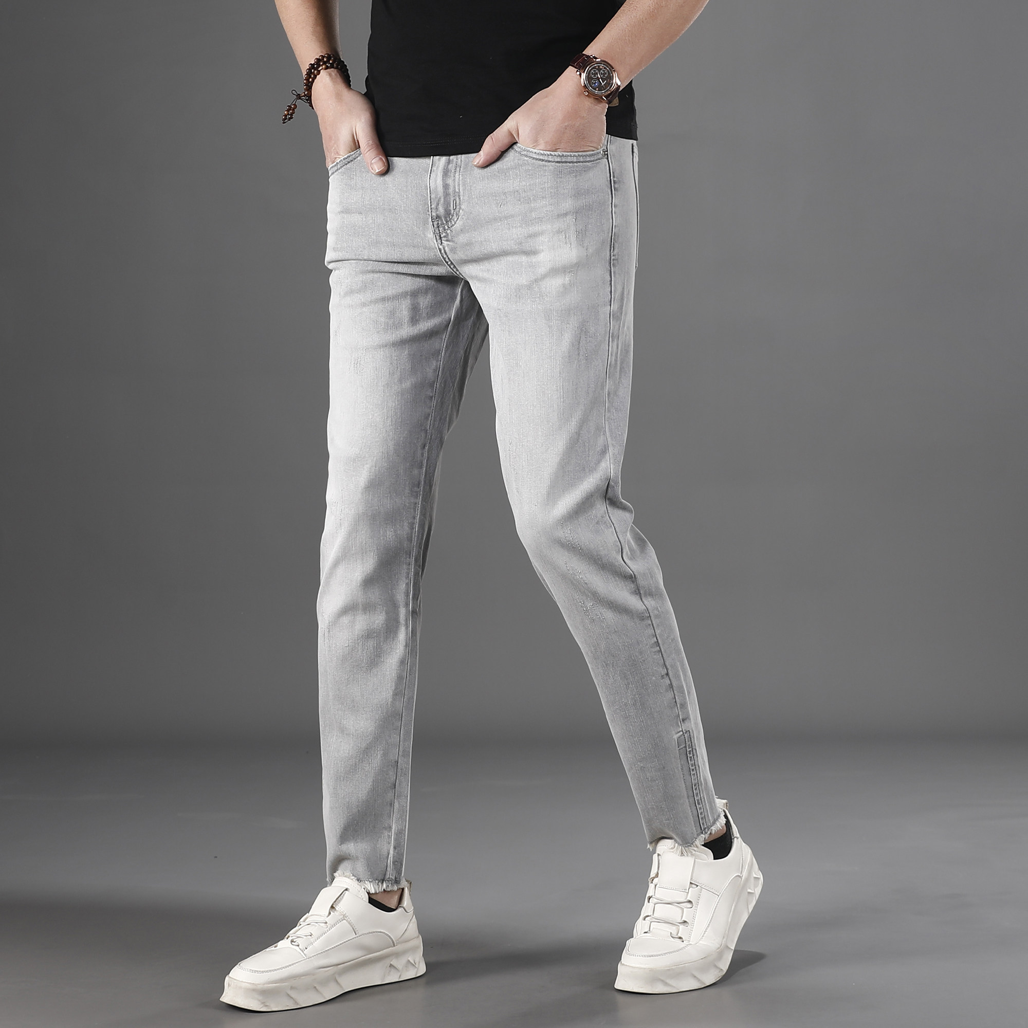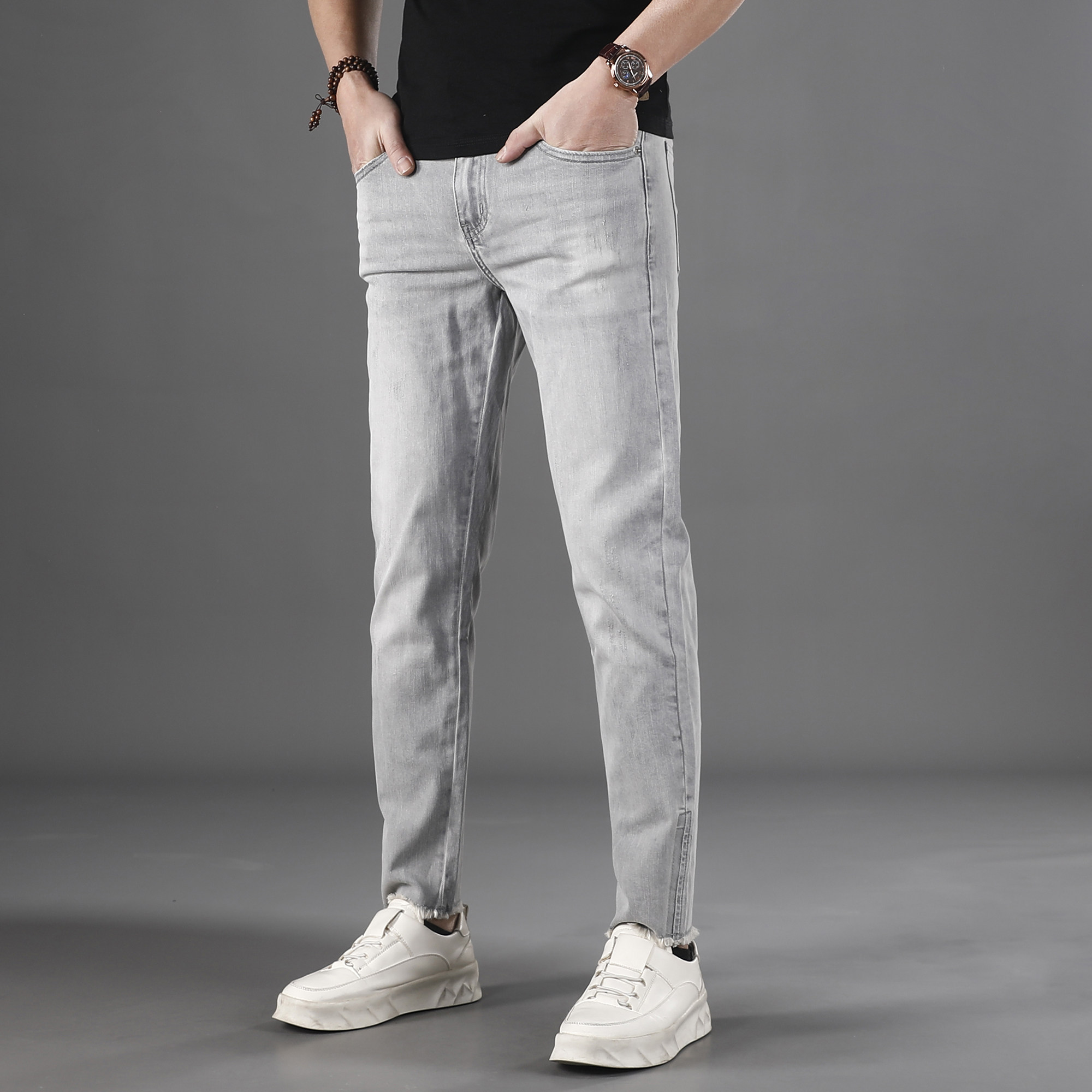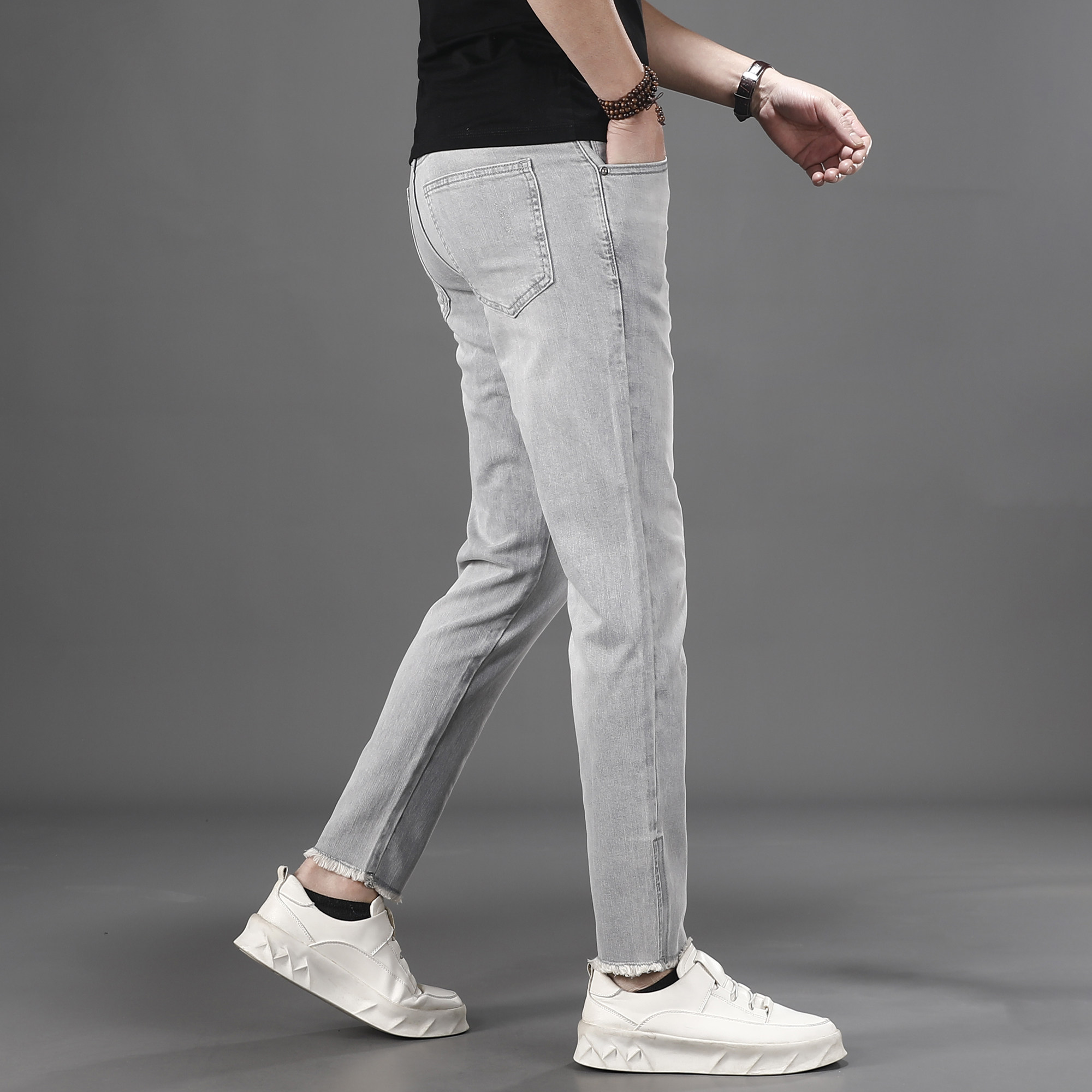 2026新款毛边浅灰色九分牛仔裤男修身小脚弹力休闲百搭9分裤子男