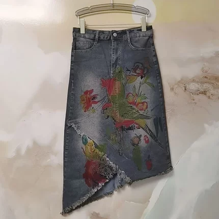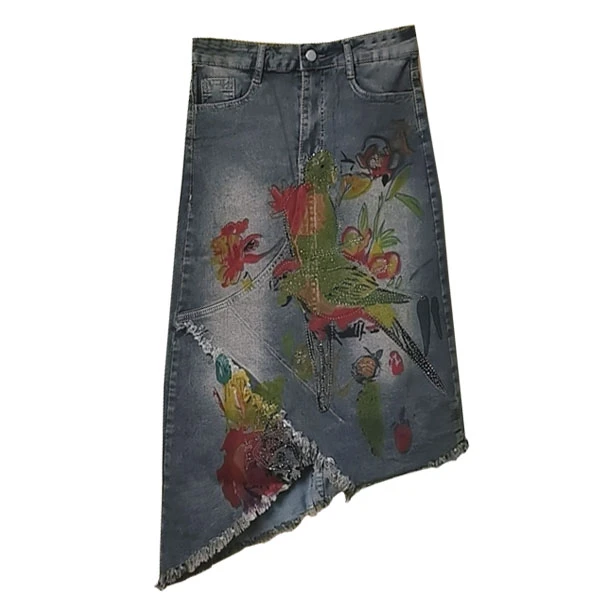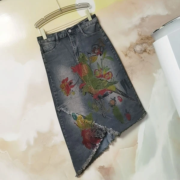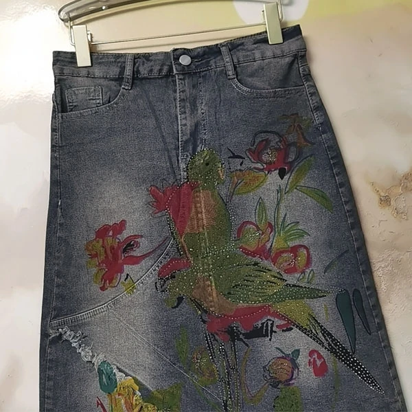 原创定制复古重工烫钻印花牛仔半身裙女夏季时尚手绘民族风中长裙