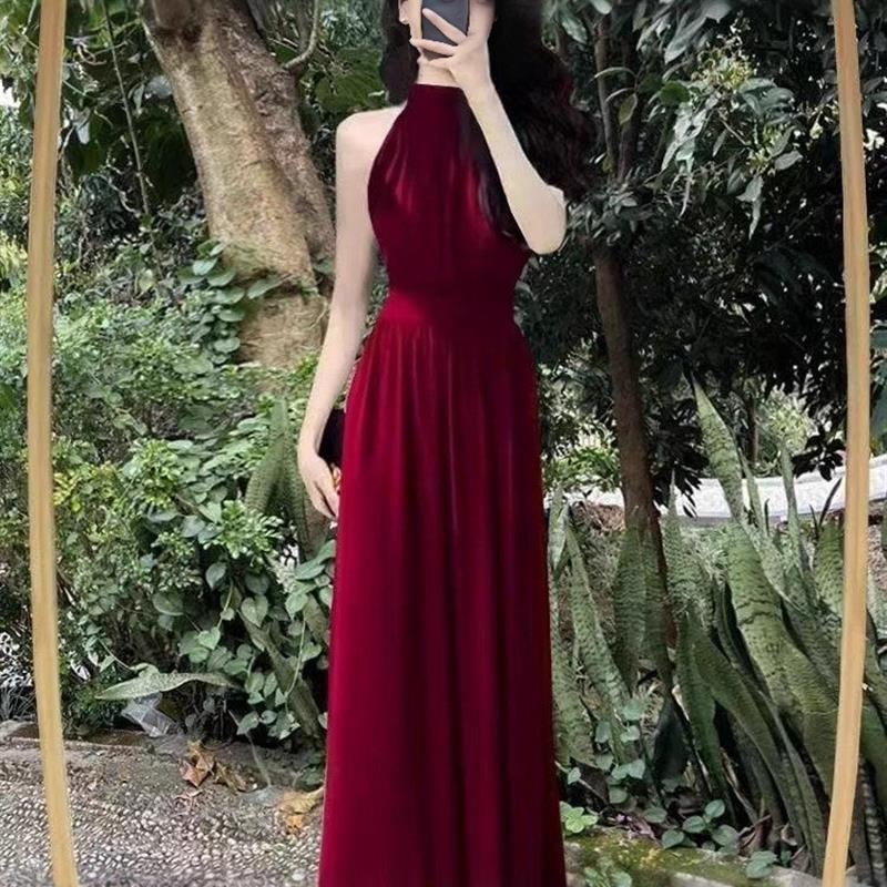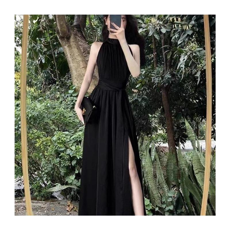 高级感黑色挂脖无袖连衣裙女2025夏季新款法式气质开叉收腰长裙子