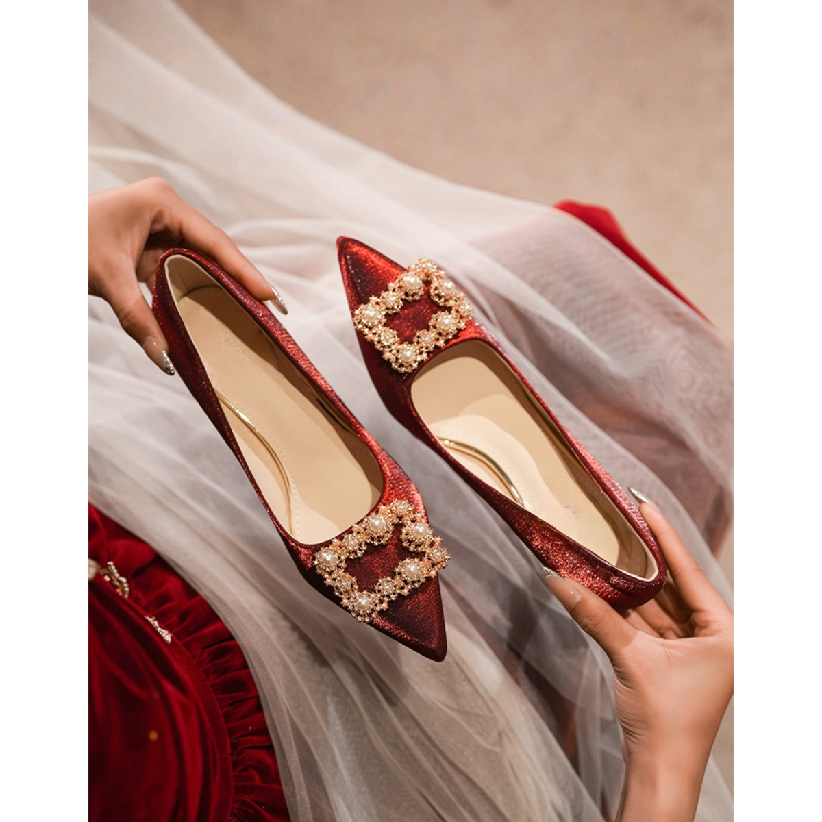 法式珍珠方扣红高跟鞋色绸缎秀禾婚鞋女不累脚细跟单鞋中式新娘鞋