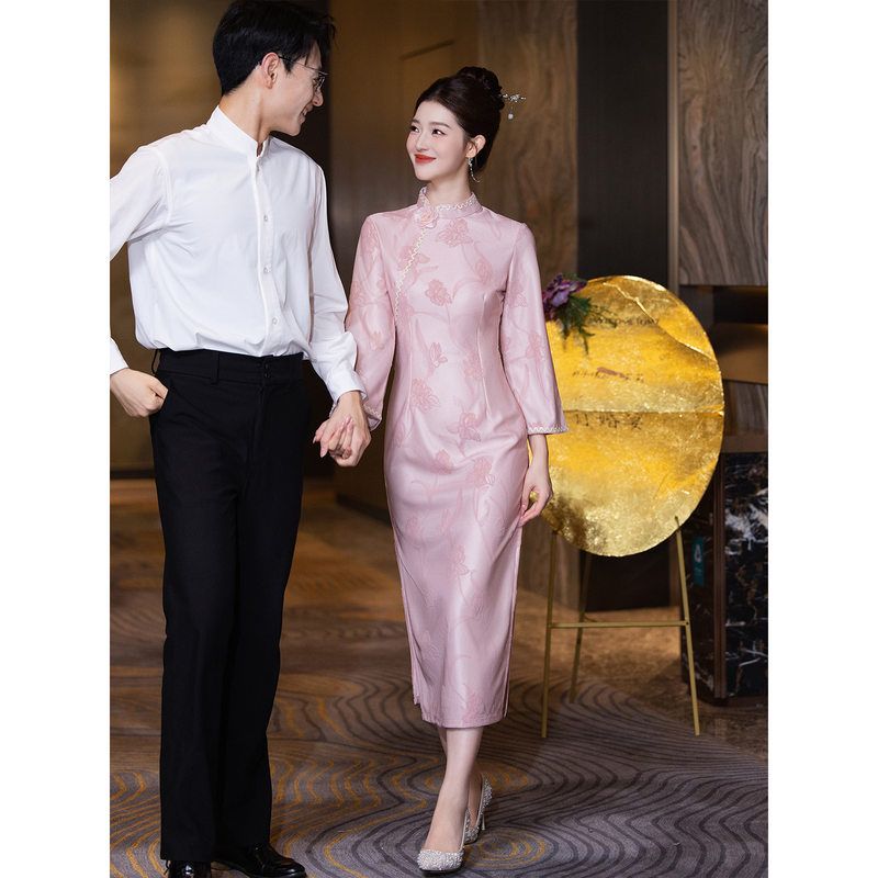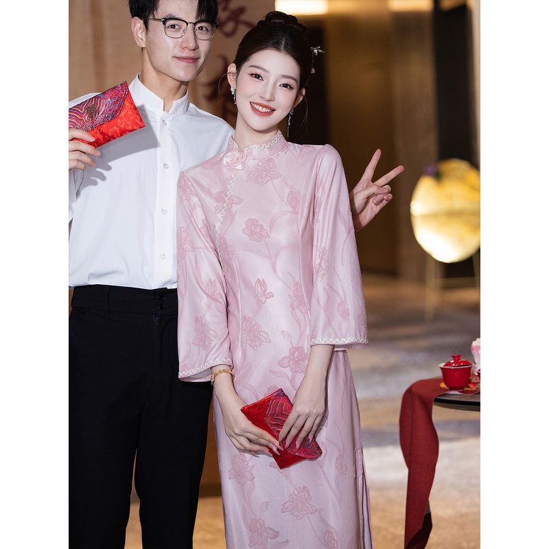 洛士旗袍登记蕾丝新款年轻领证款连衣裙复古粉色优雅年新中式2025