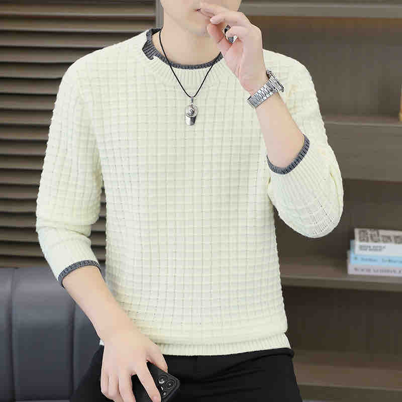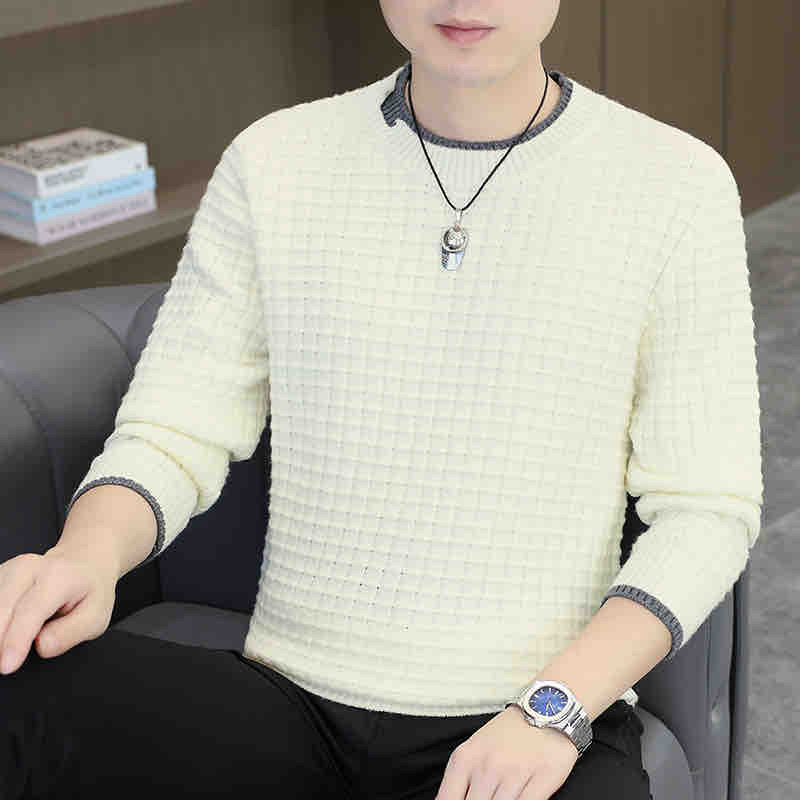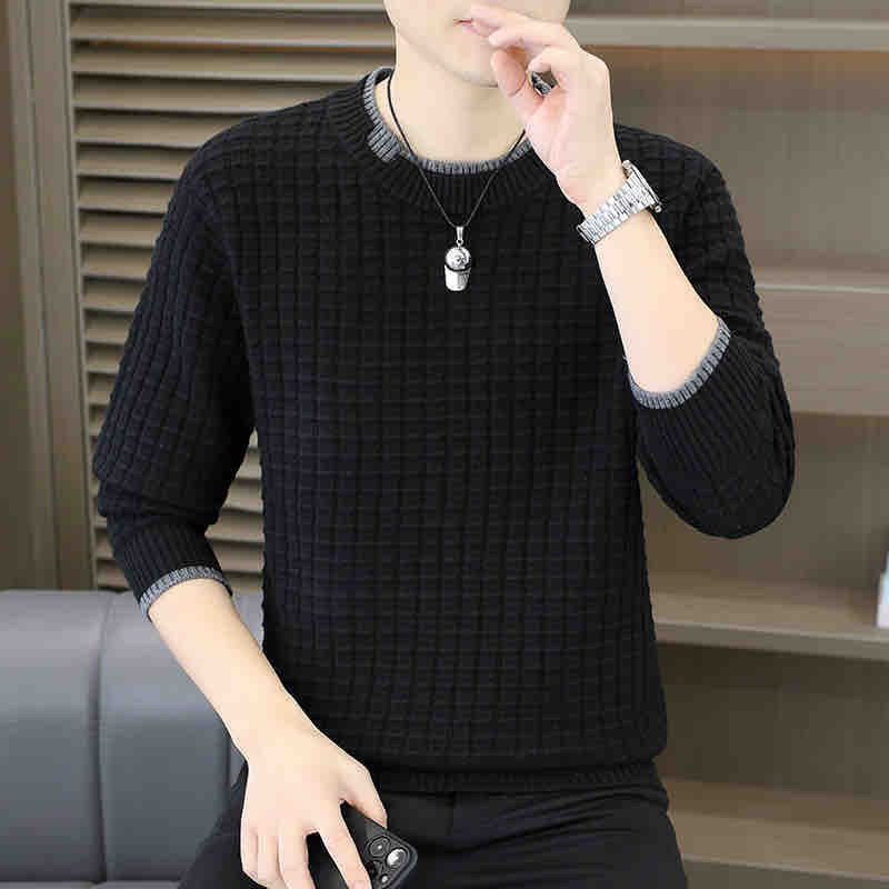 圆领毛衣男士春秋款潮牌修身打底针织衫男生高级感纯色格纹毛线衣
