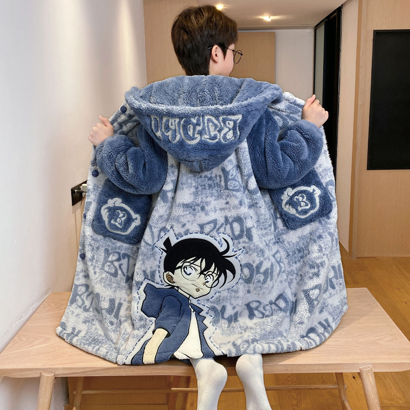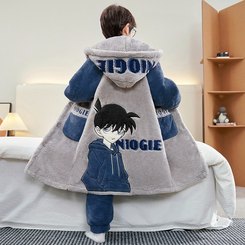 男童珊瑚绒睡袍加厚秋冬装中大童罗小黑儿童法兰绒家居服睡衣套装