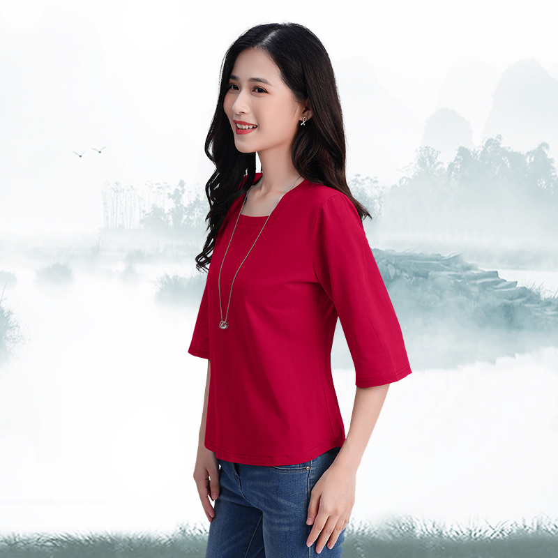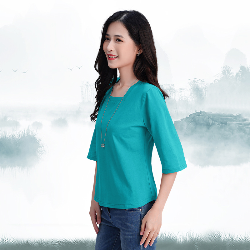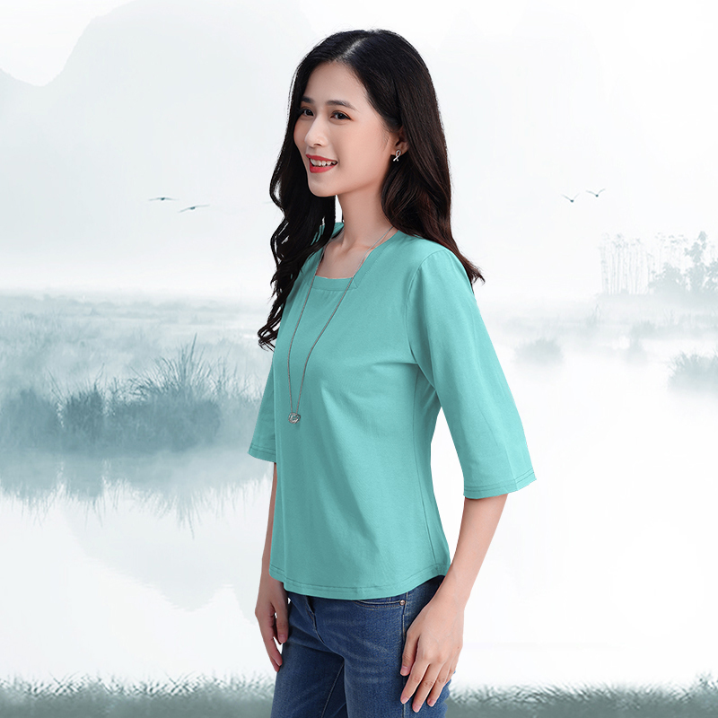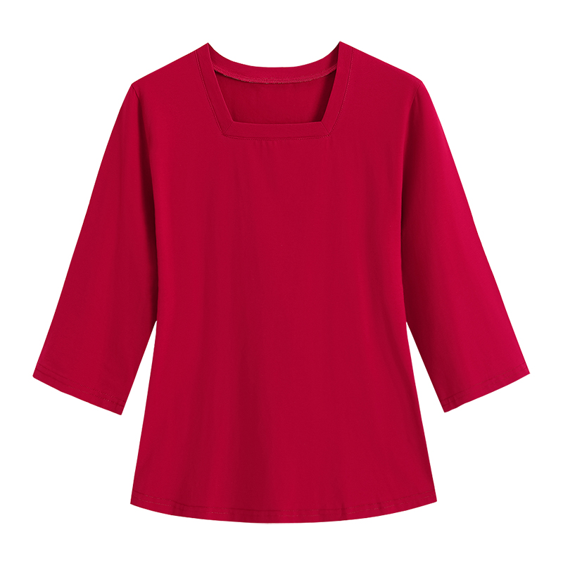 七分袖纯棉宽松方领T恤女显瘦韩版打底衫时尚春夏百搭透气上衣