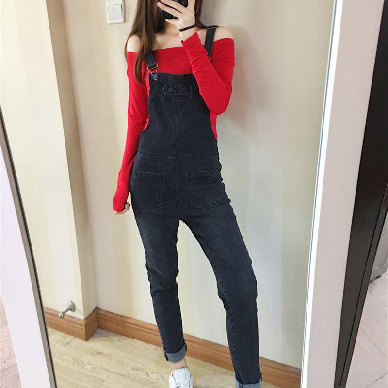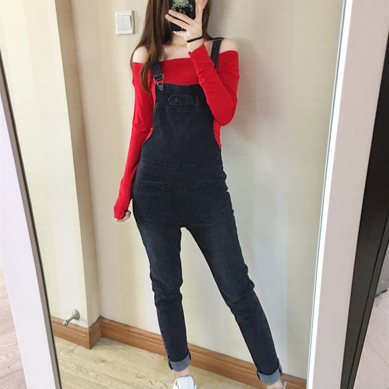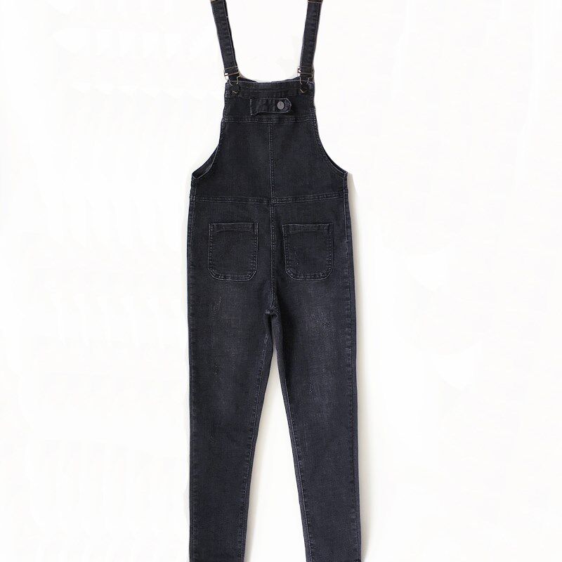 2025韩版弹力牛仔背带裤女9分裤小脚修身休闲显瘦黑色做旧吊带裤