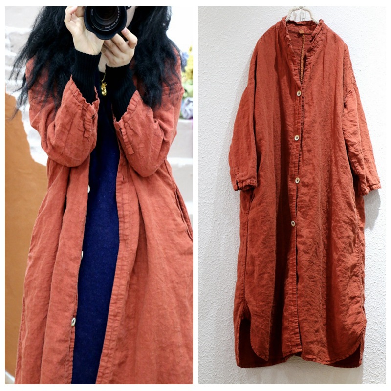22年新款青春新品设计师款品质亚麻大版气质长款风衣纯色文艺开衫