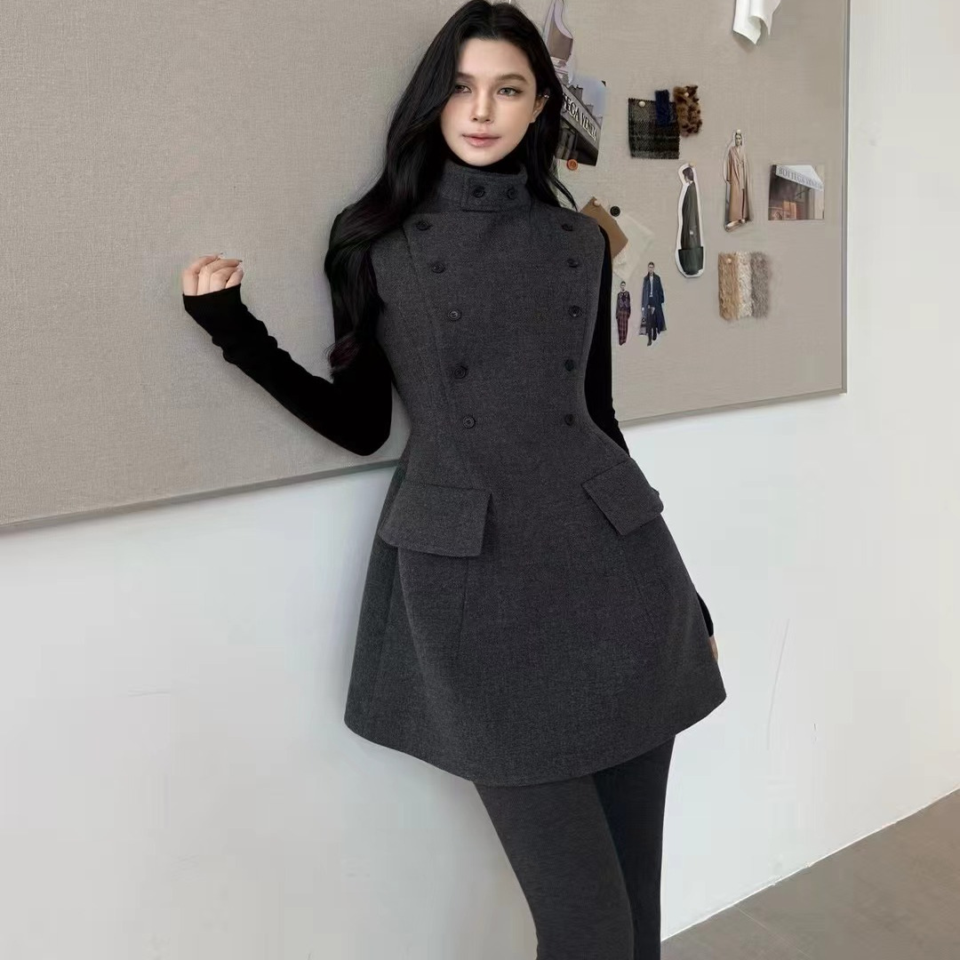 V.N韦恩韩版双排扣无袖收腰气质连衣裙2025新款冬季毛呢西装裙女