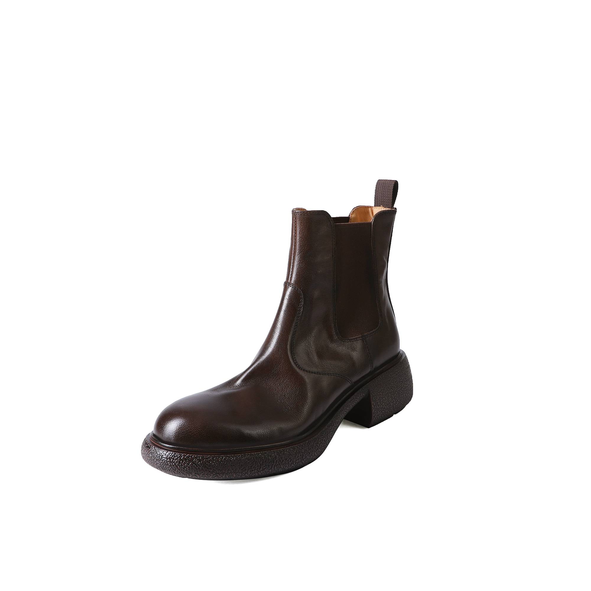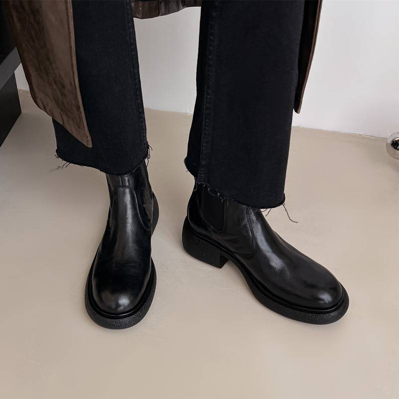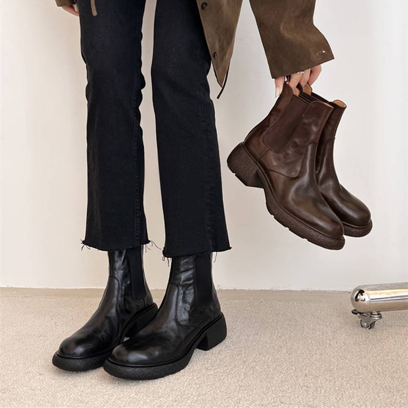 手抓~头层牛皮!英伦复古圆头马丁靴女棕色切尔西靴粗跟厚底短靴