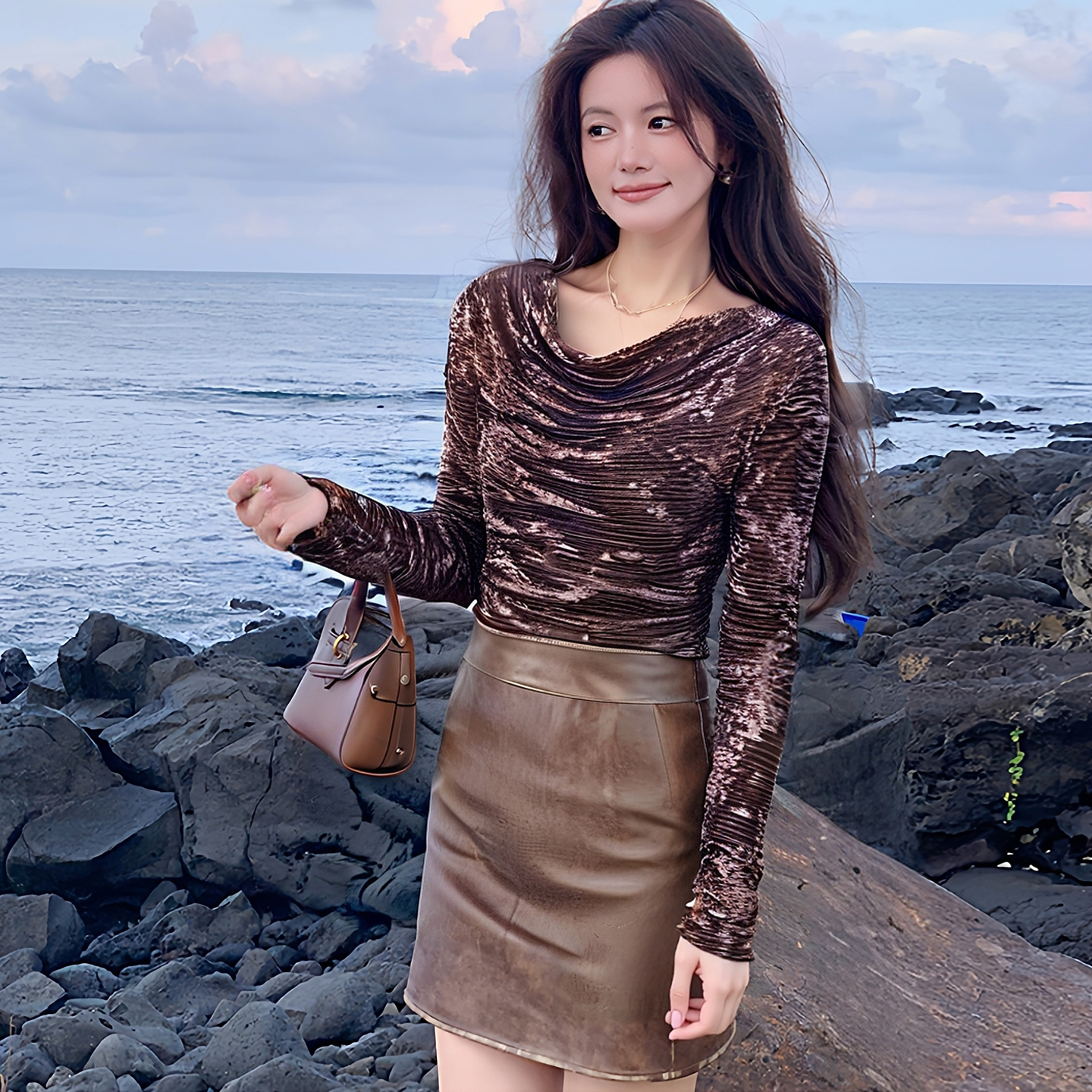 2025秋装新款轻奢优雅褶皱荡领丝绒上衣女收腰显瘦气质T恤打底衫