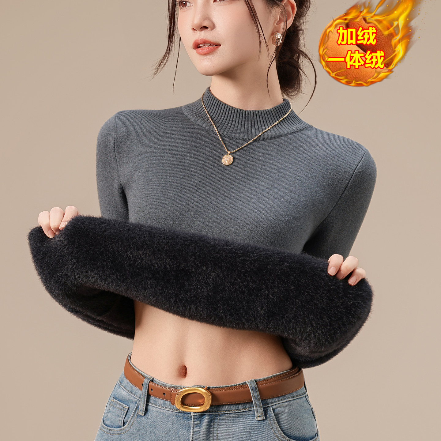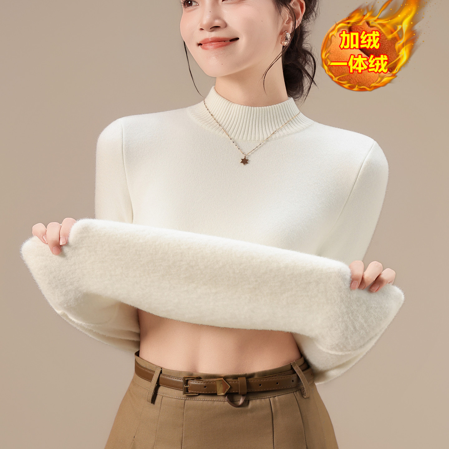 秋冬加绒毛衣女加厚一体绒内搭大码半高领套头打底针织衫保暖上衣
