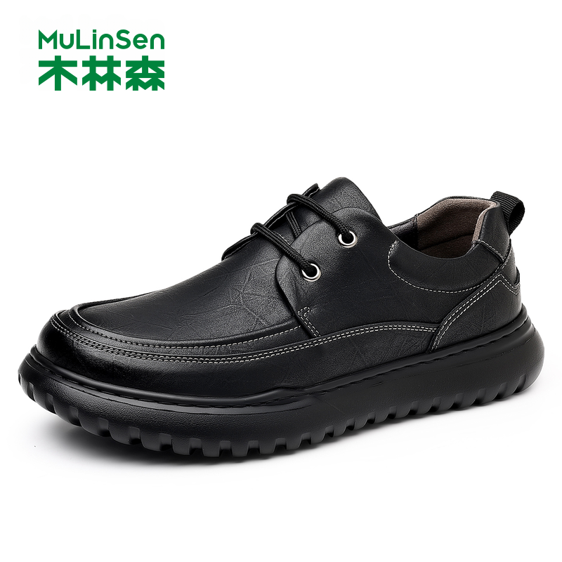 木林森男鞋真皮休闲皮鞋黑色系带圆头轻便百搭男士休闲鞋时尚百搭
