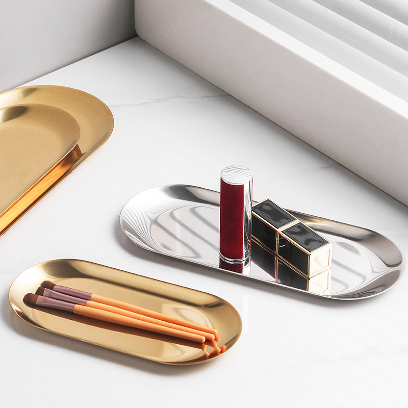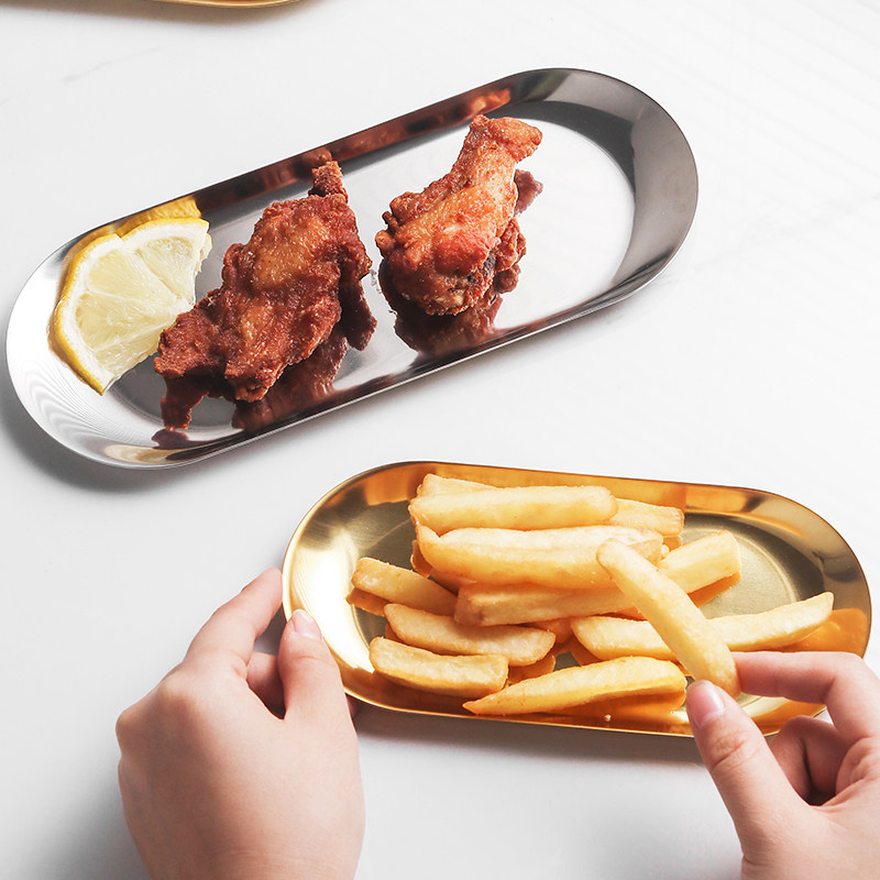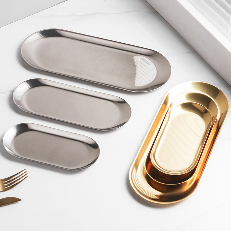 韩式不锈钢椭圆盘旦形烤肉盘子金色首饰盘咖啡托盘蛋糕水果盘餐厅