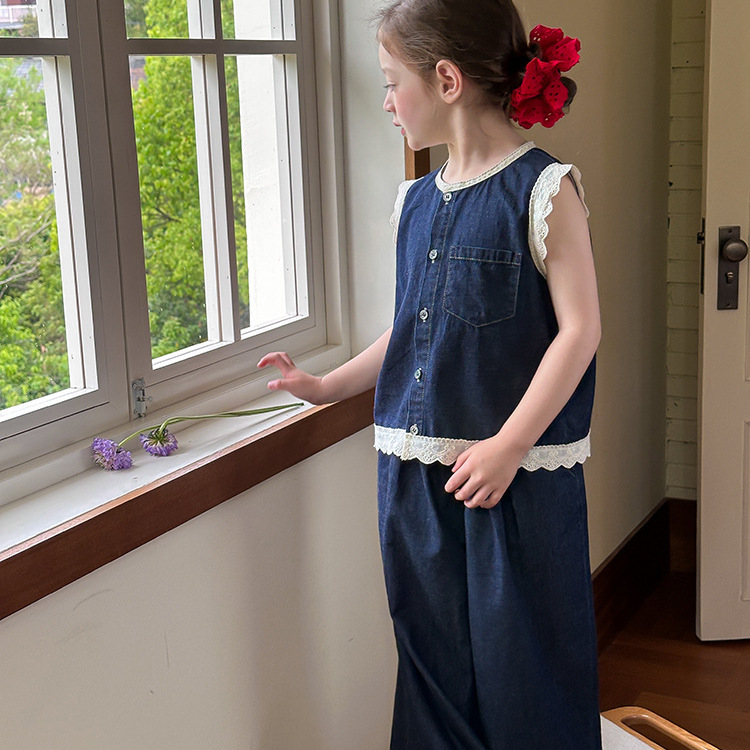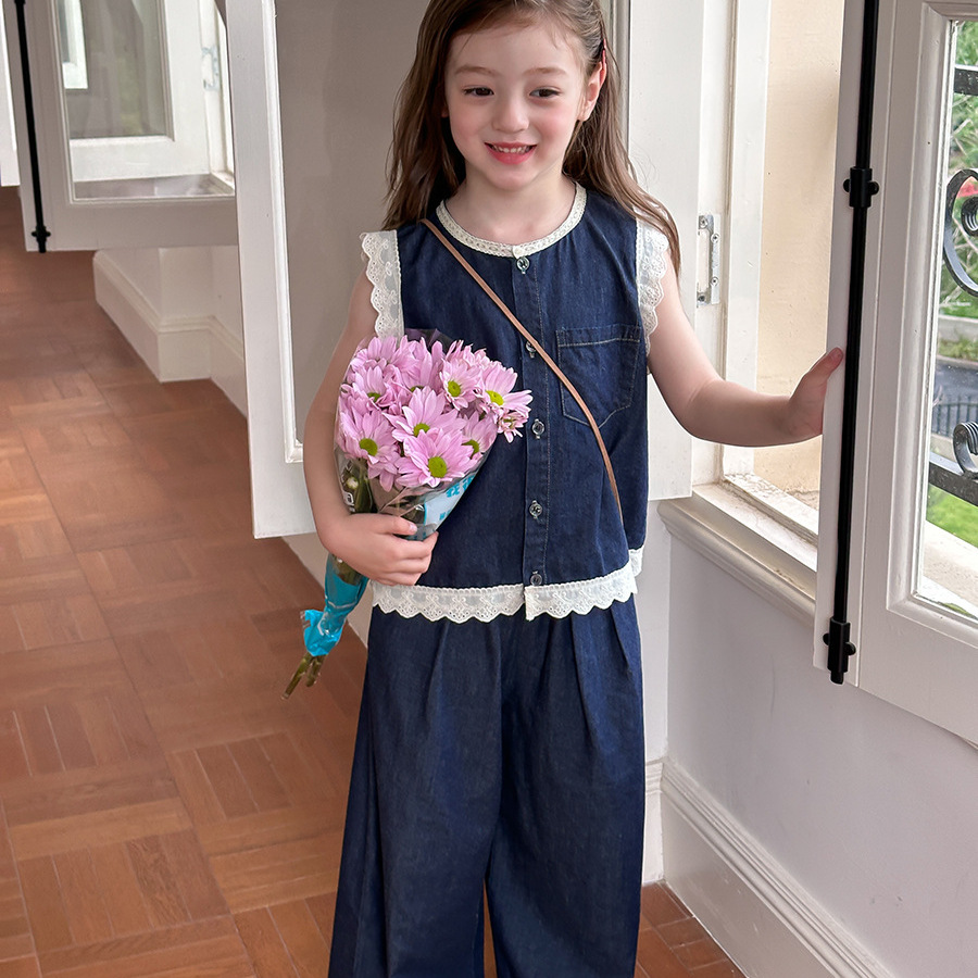 女童套装2025夏季新款亲子款上衣阔腿裤儿童花边背心牛仔裤两件套