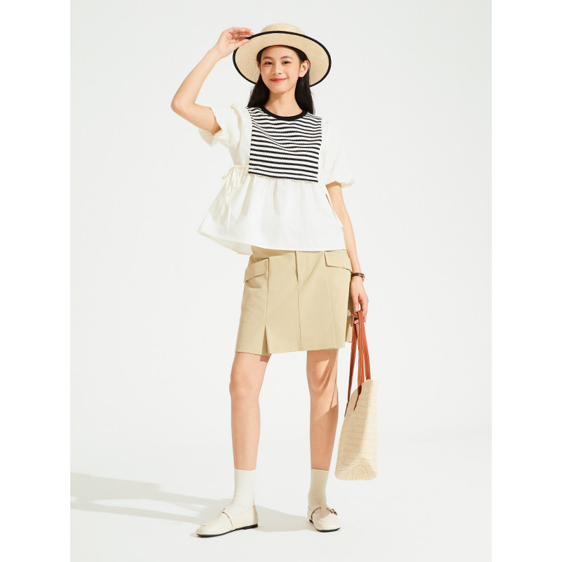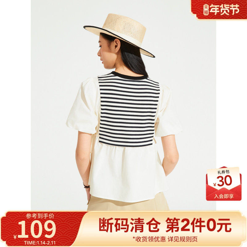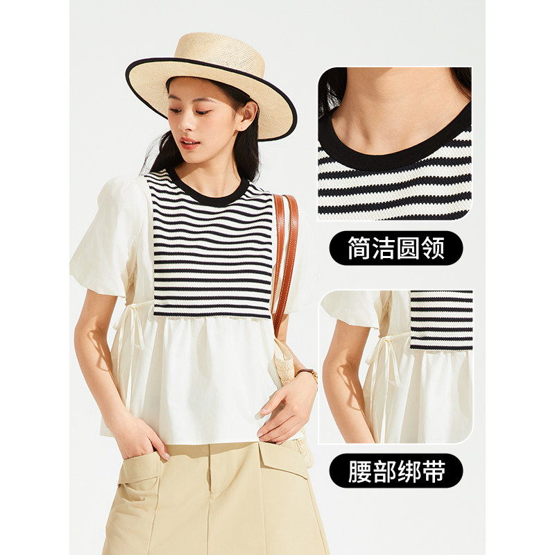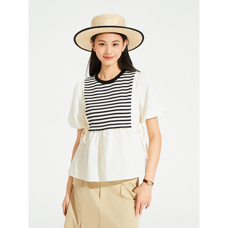热风2024年夏季新款女士时尚圆领拼接上衣休闲甜美绑带设计衬衫潮