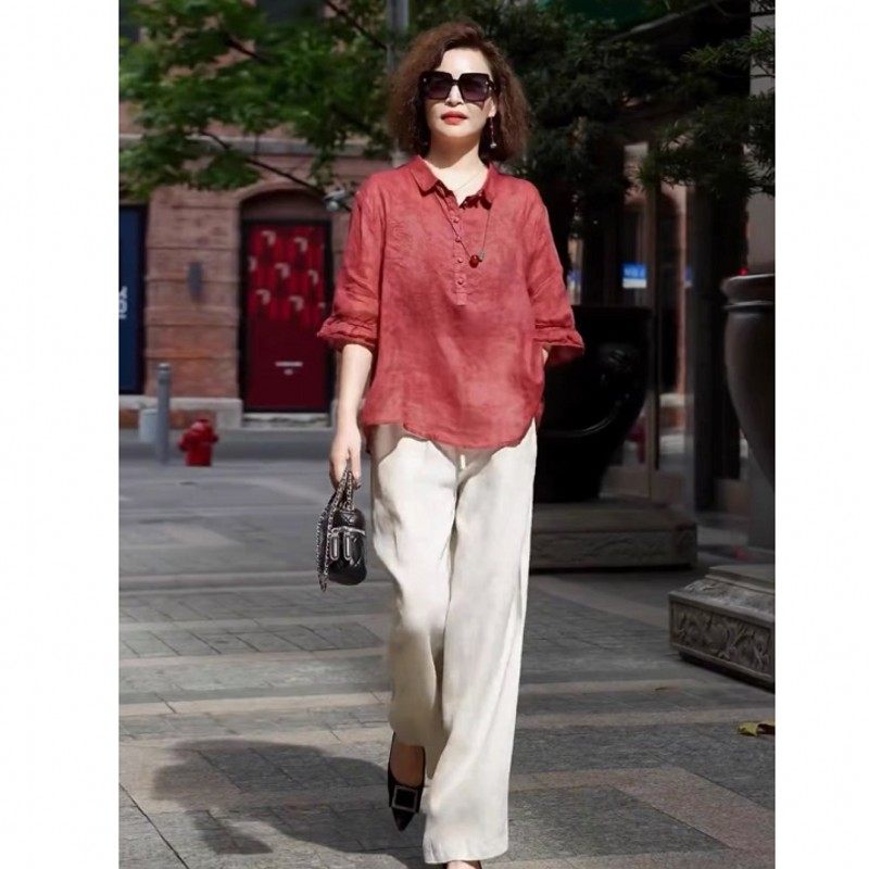 洋气阔太太天丝棉麻套装女夏季中年妈妈宽松亚麻上衣阔腿裤两件套