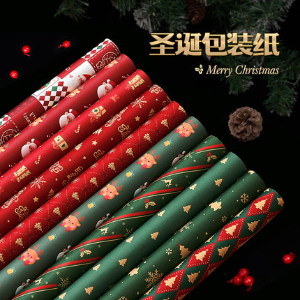 圣诞节礼物包装纸牛皮纸整卷高级感超大尺寸礼品礼盒打包儿童包书皮材料加丝带复古彩纸卡通装饰加厚花纸红色