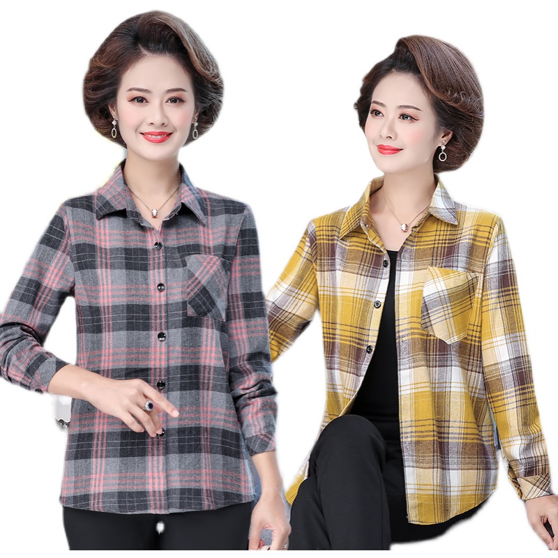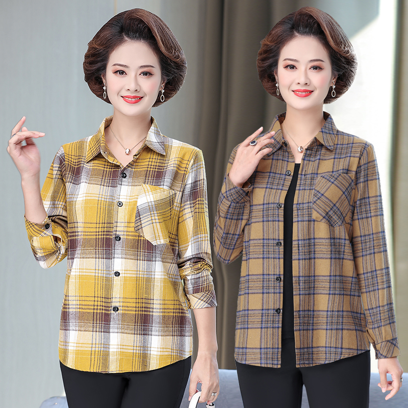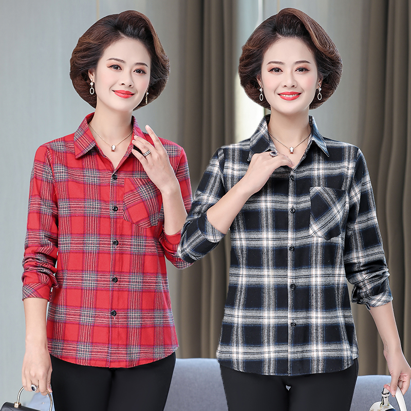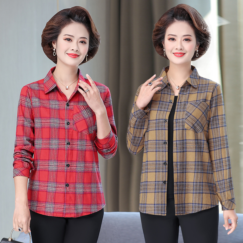 妈妈纯棉衬衫中老年春秋长袖格子衬衫女中年夏装薄款外套女装上衣