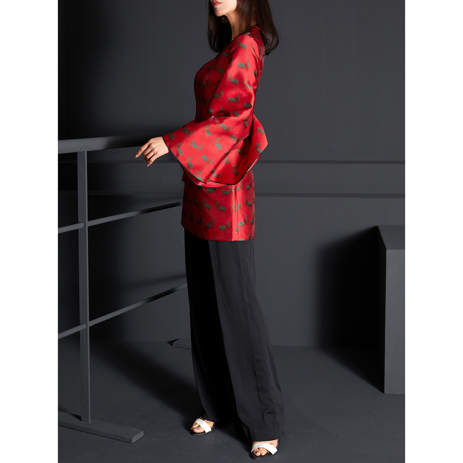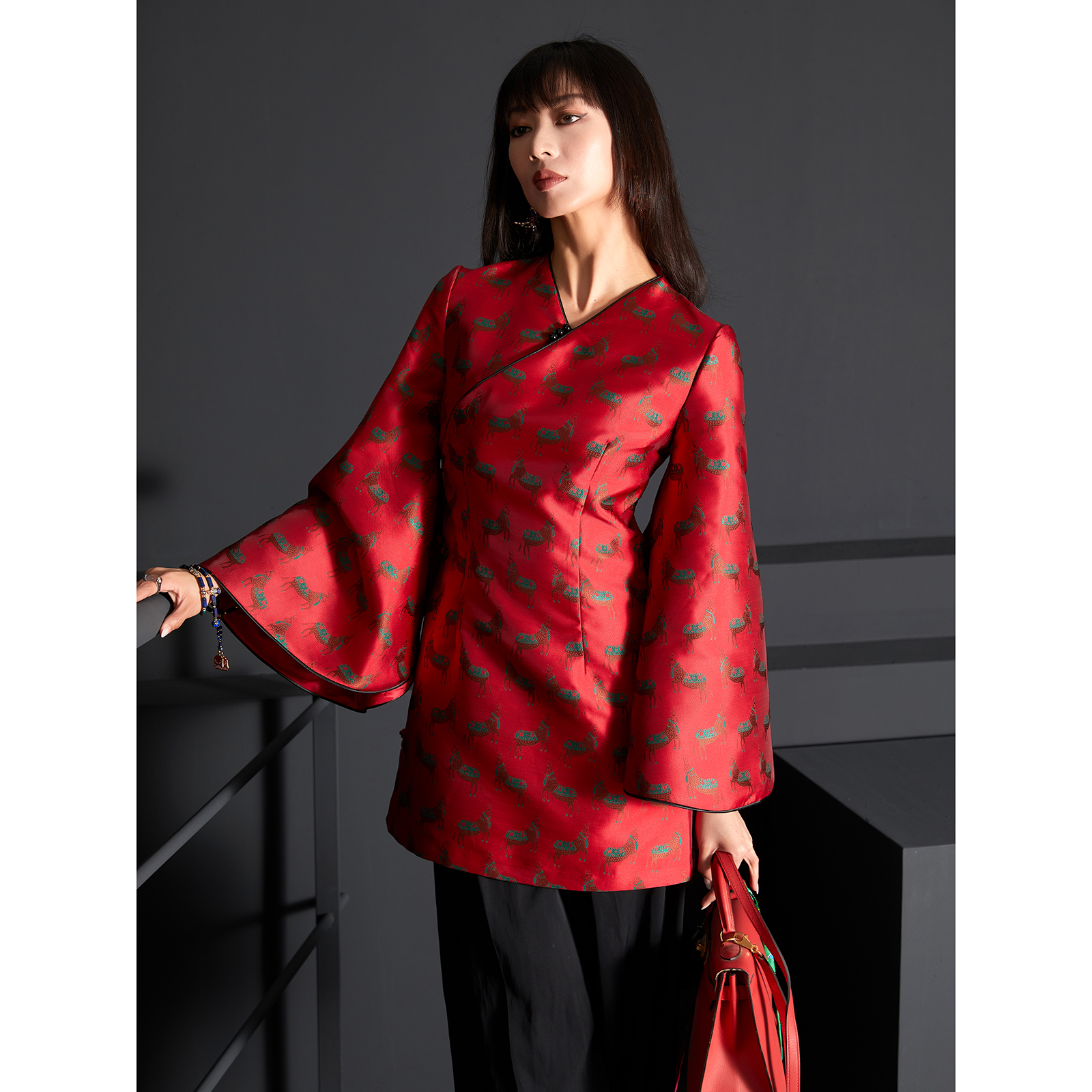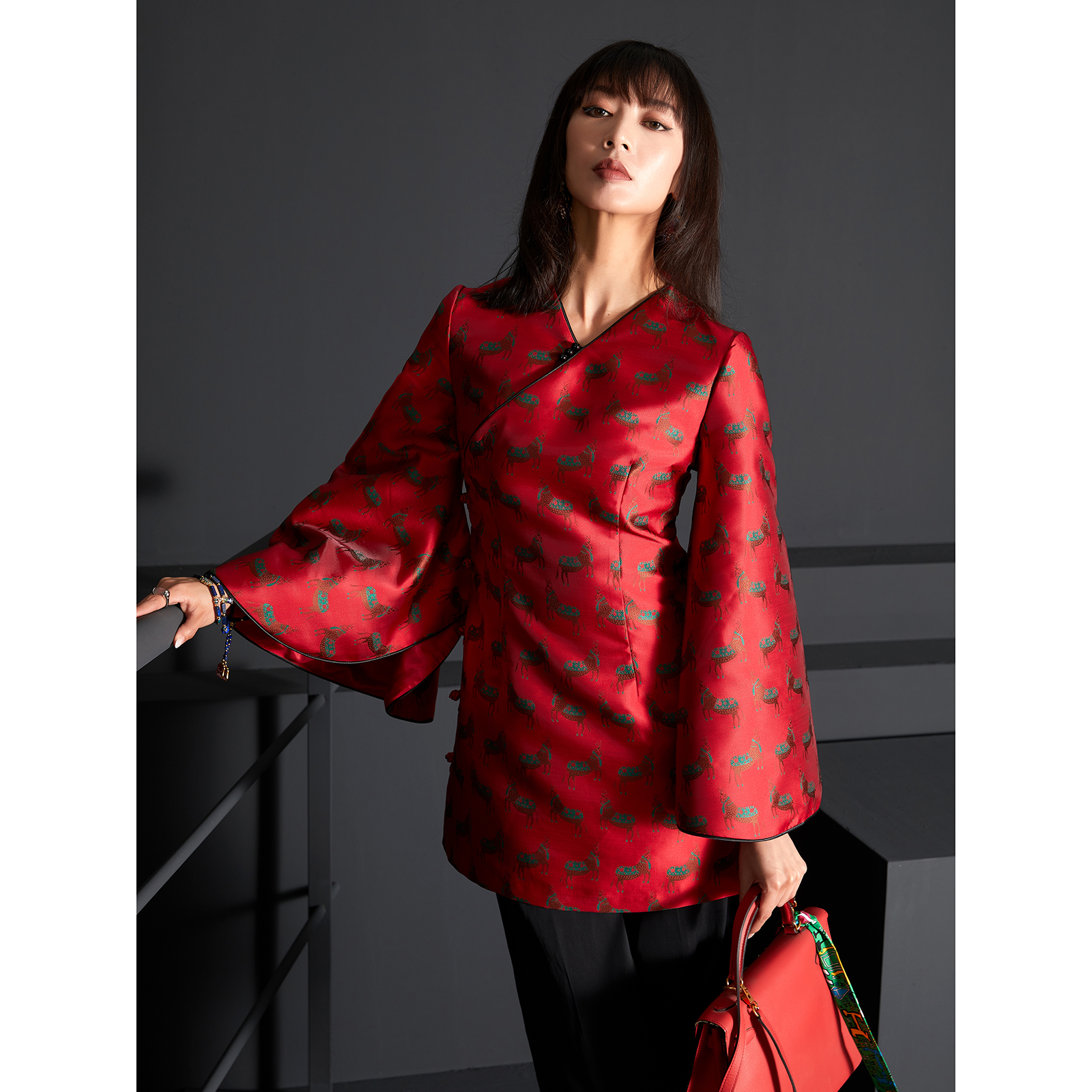 扶郎2024设计师原创店 新款日系和风 喇叭袖提花红色少女旗袍短裙