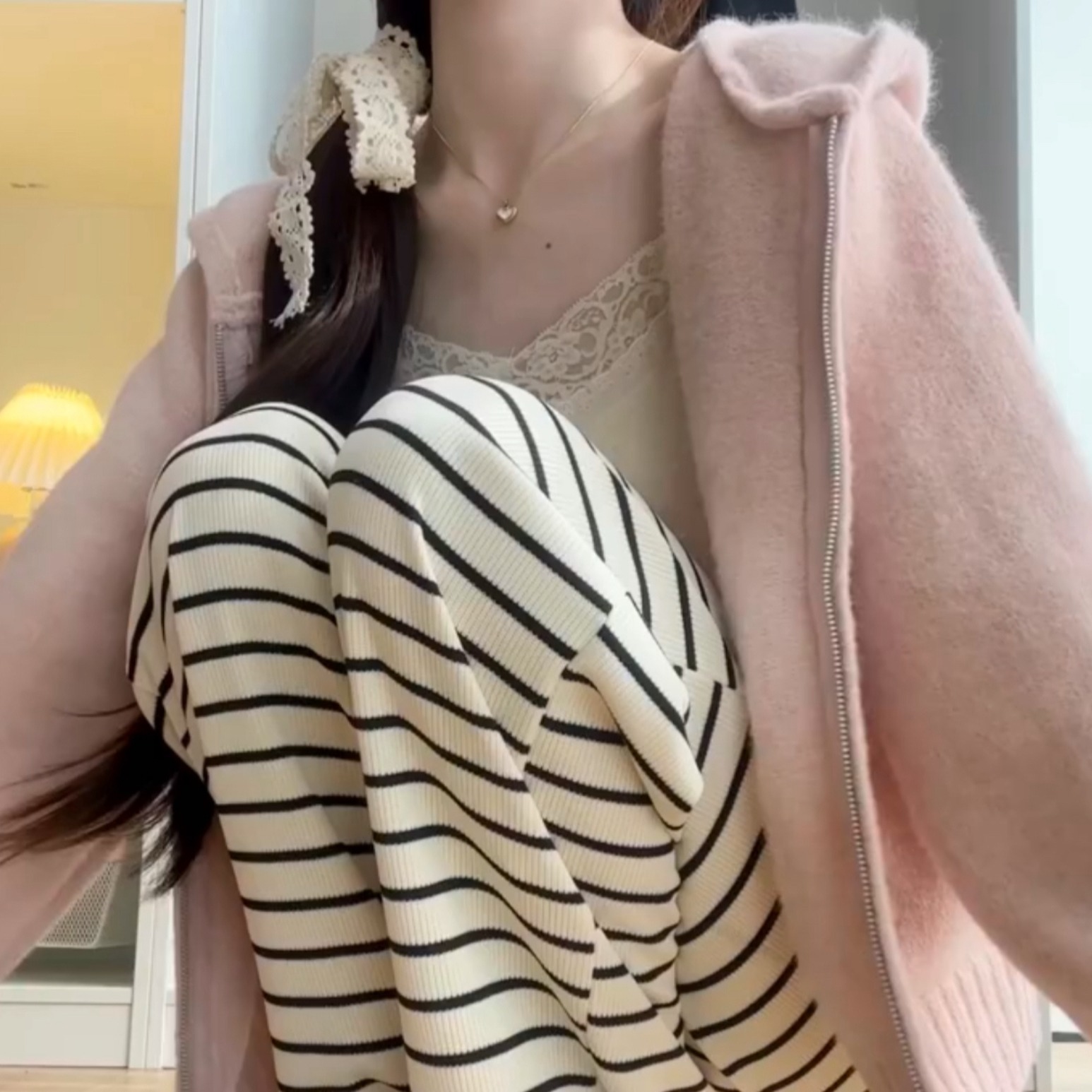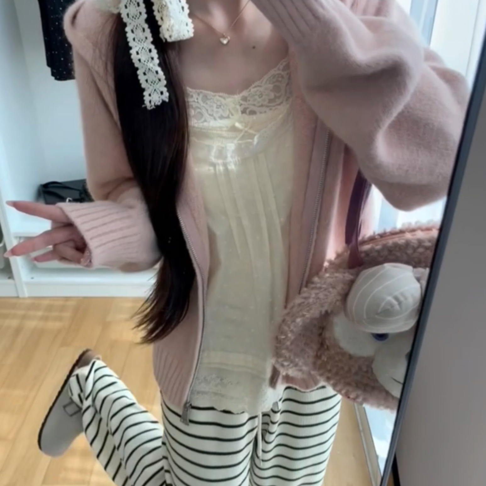 粉色长袖针织连帽毛衣外套女秋季韩系短款拉链外穿上衣濮院羊毛衫