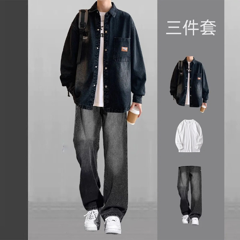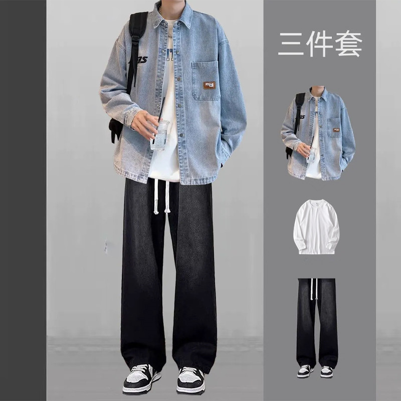 牛仔外套男生潮流套装春秋季薄款夹克高级感青少年帅气穿搭三件套