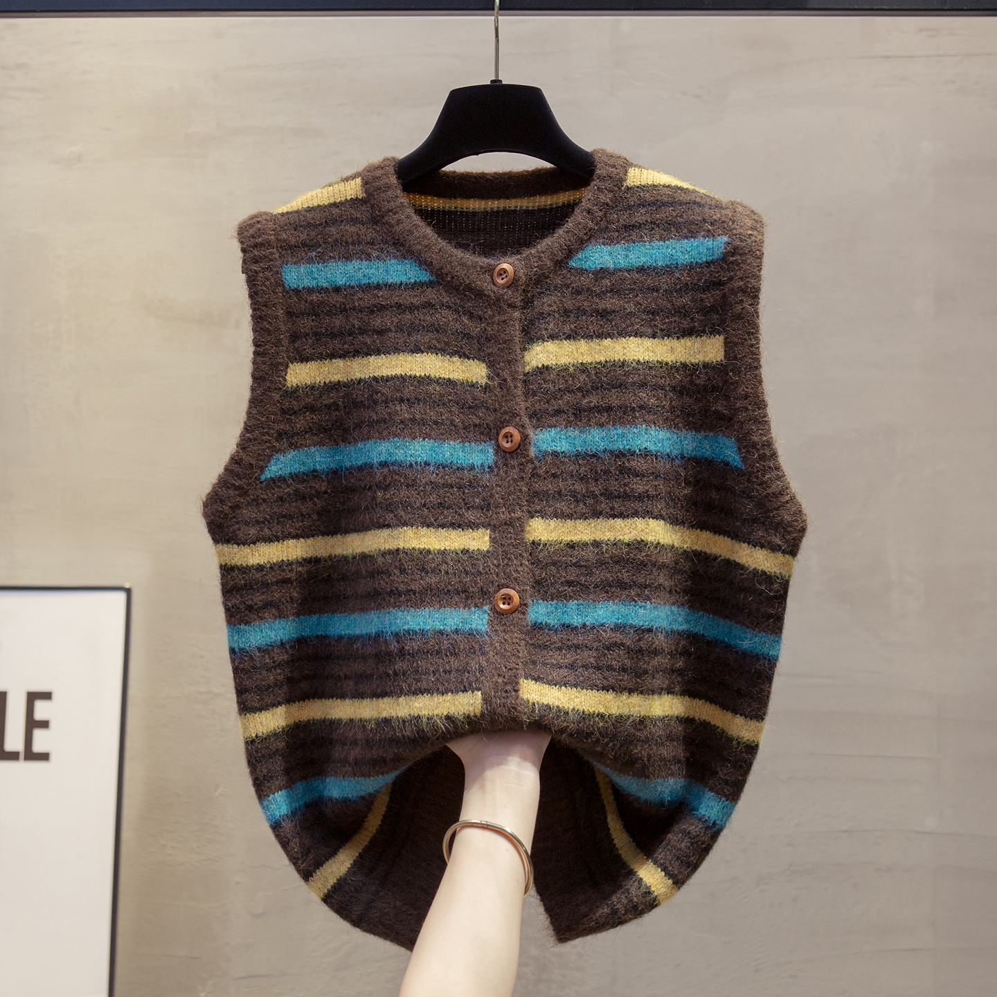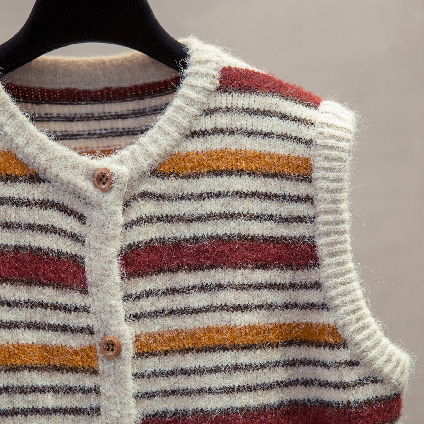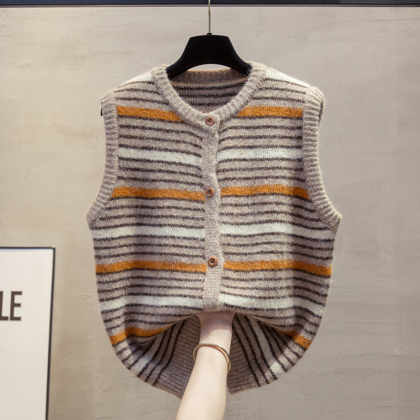 条纹圆领开衫针织马甲背心女2025秋冬新款宽松马夹叠穿毛衣坎肩潮