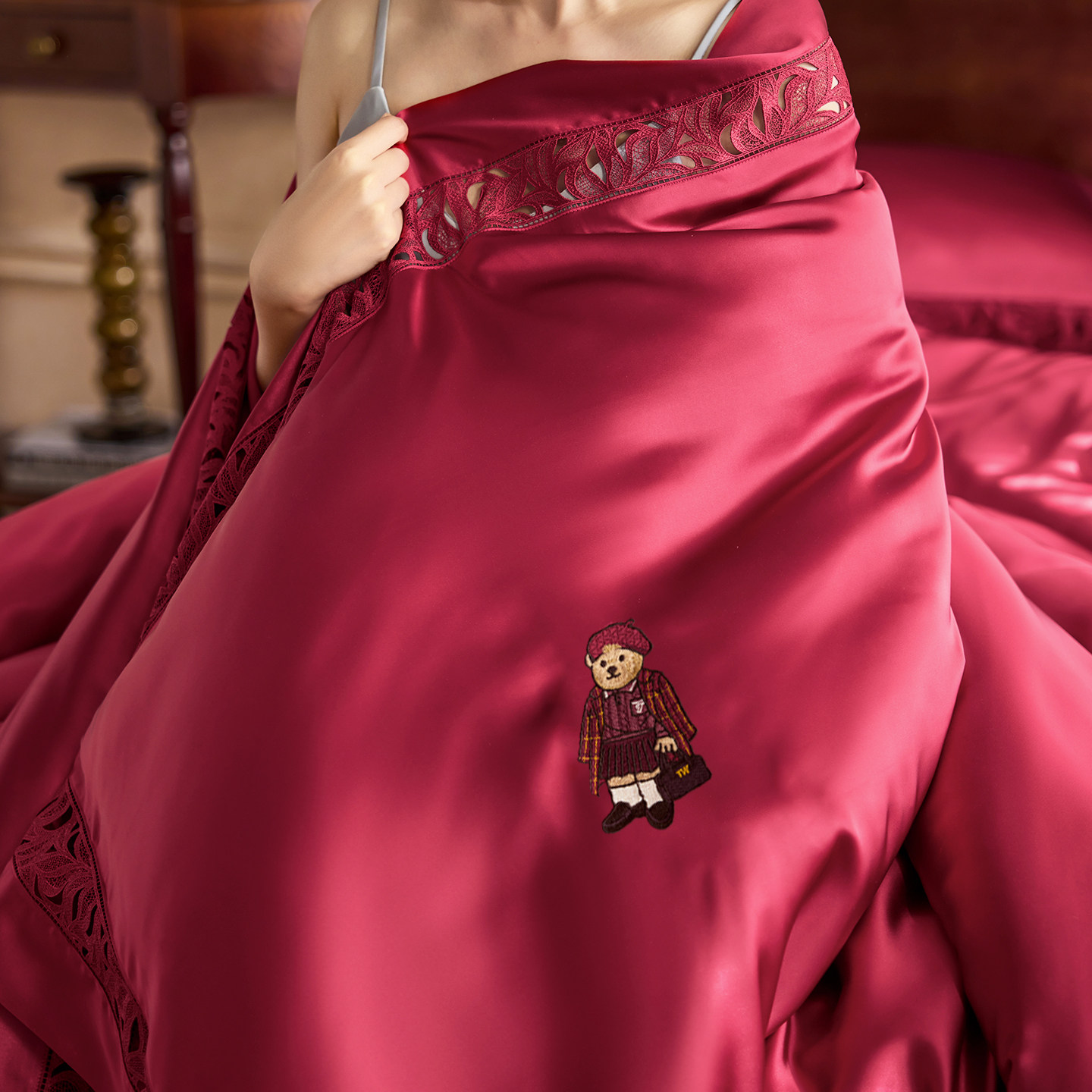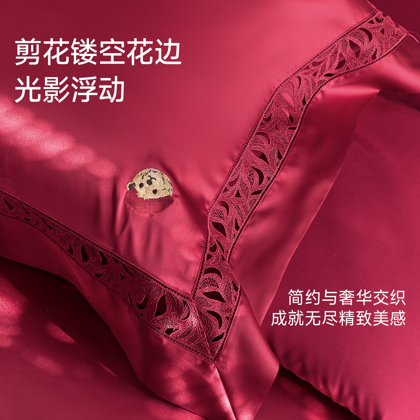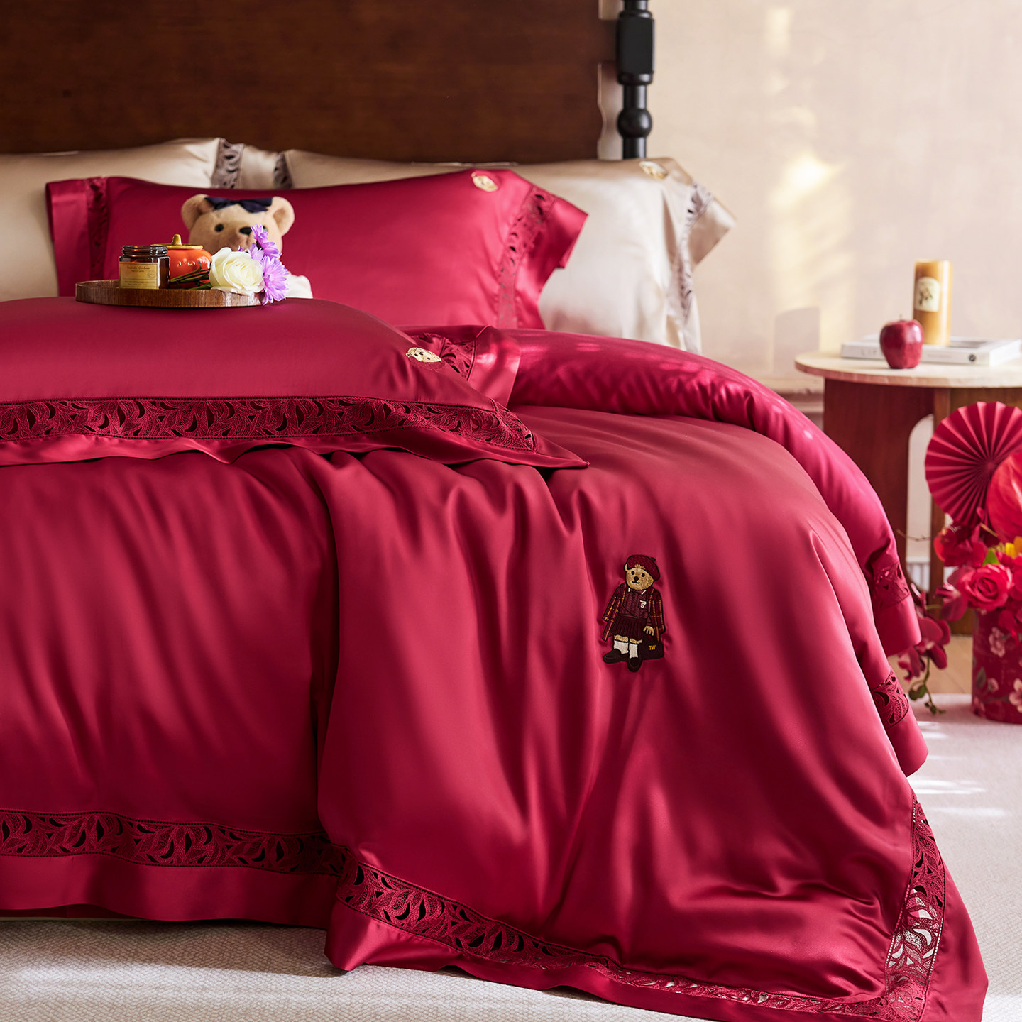 TeenieWeenie轻奢结婚大红色真丝四件套高端喜庆剪花镂空被套床单