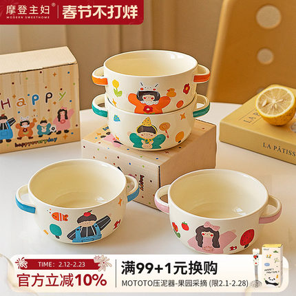 摩登主妇一家三口双耳蒸蛋碗家用陶瓷碗具儿童饭碗宝宝辅食碗汤碗