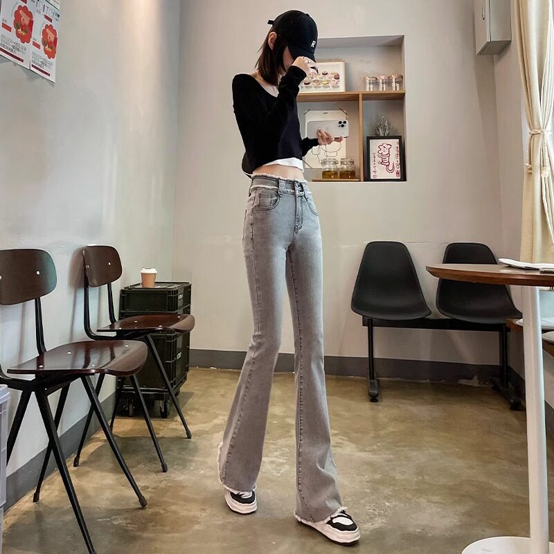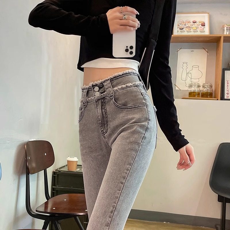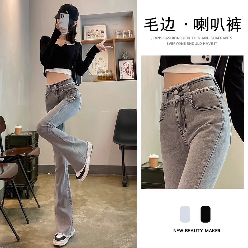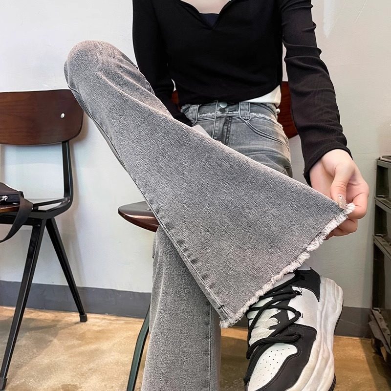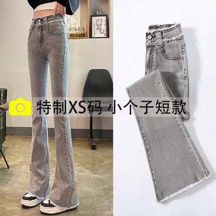 烟灰色高腰微喇叭牛仔裤女2025年春夏新款紧身毛边显瘦小个子九分
