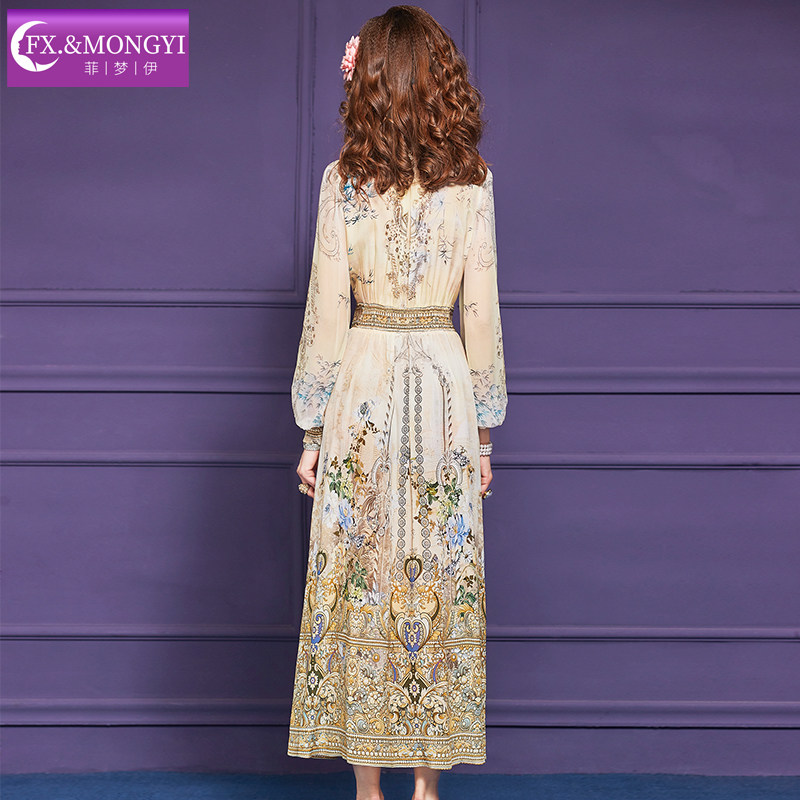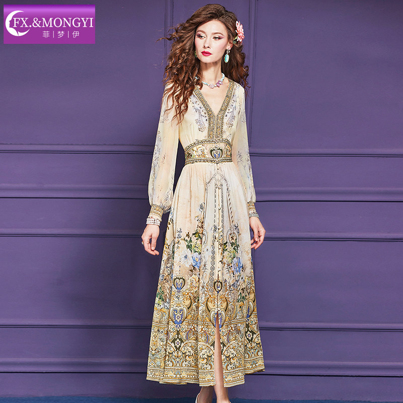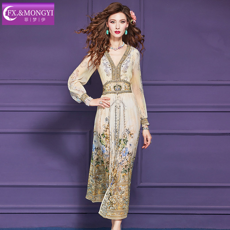 菲梦伊100桑蚕丝印花连衣裙女春季高品质真丝镶钻旅游度假长裙子