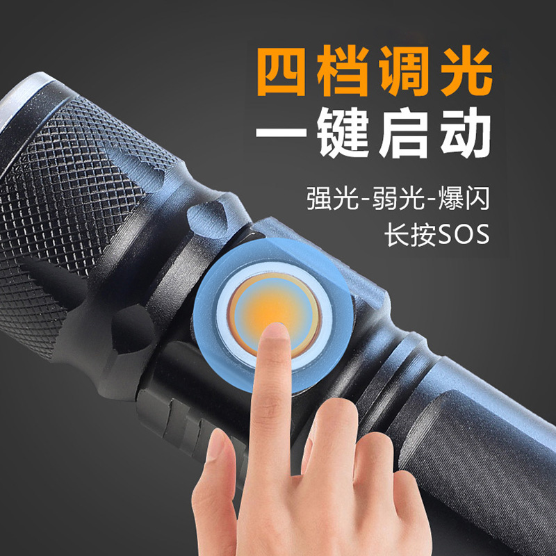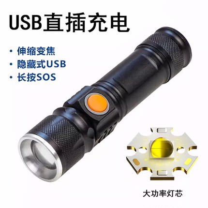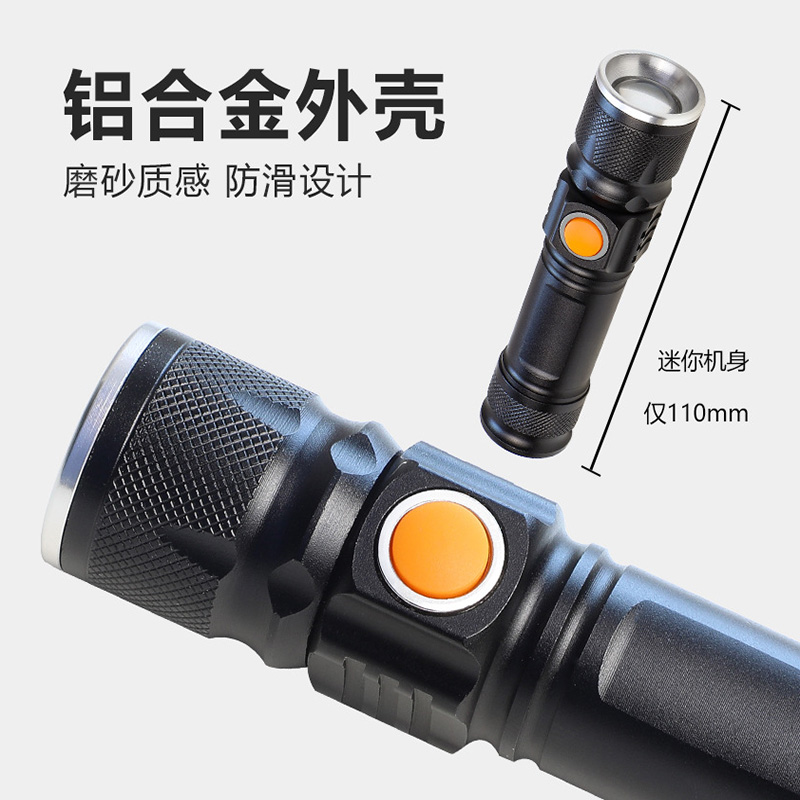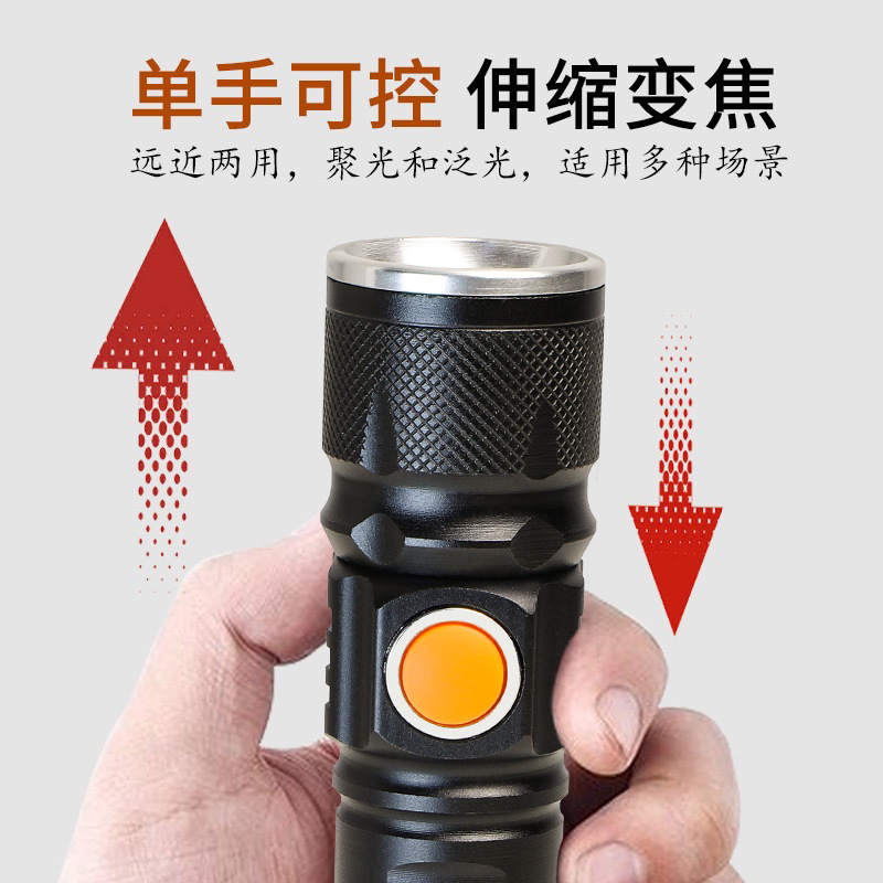 新款强光XHP50小巧变焦手电筒金属锂电池四档调光隐藏式USB充电口