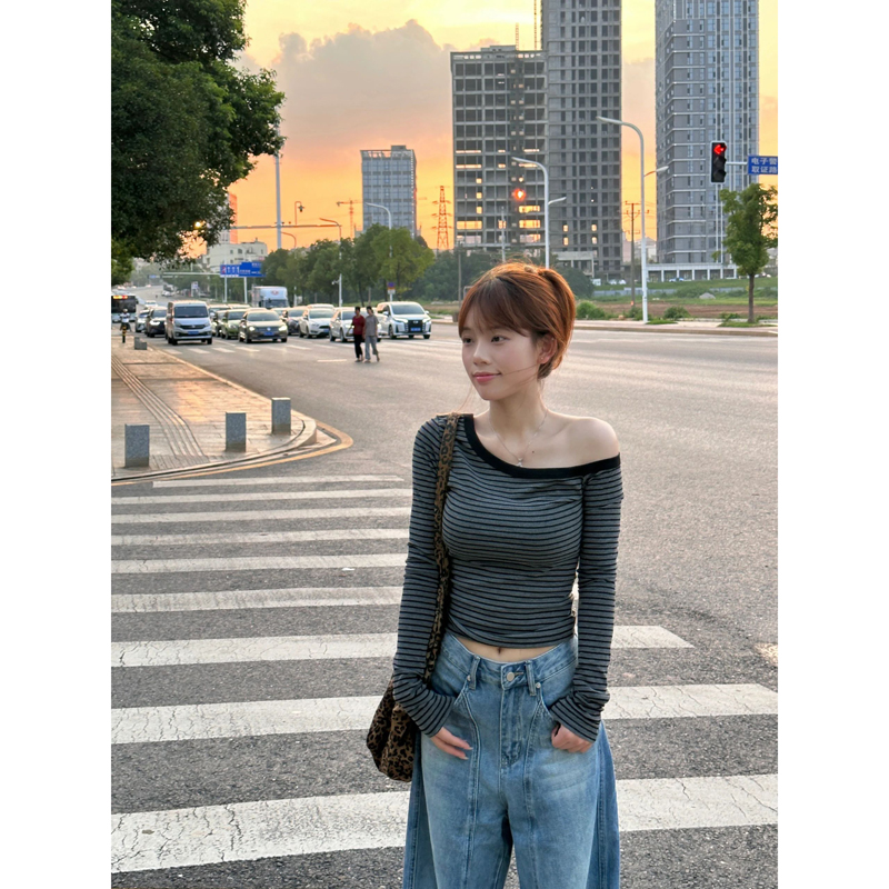 纯欲斜露肩条纹长袖t恤女早秋季内搭打底衫修身显瘦辣妹短款上衣