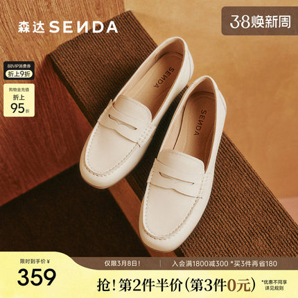 森达白色乐福鞋女鞋新款商场同款牛皮舒适通勤皮鞋平底鞋黑色单鞋