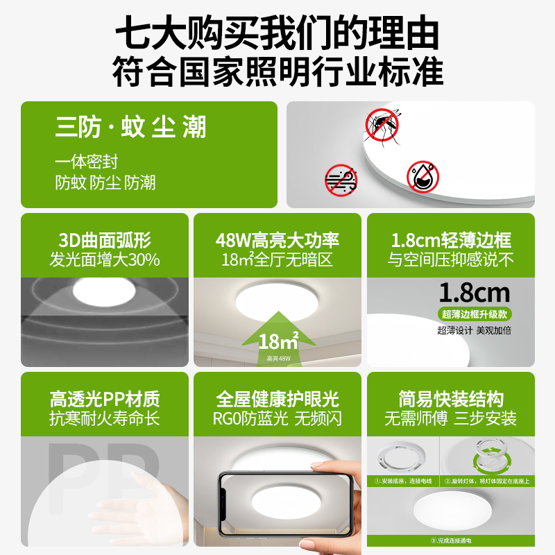 三雄极光护眼卧室吸顶灯2025新款现代三防灯led过道阳台房间灯具