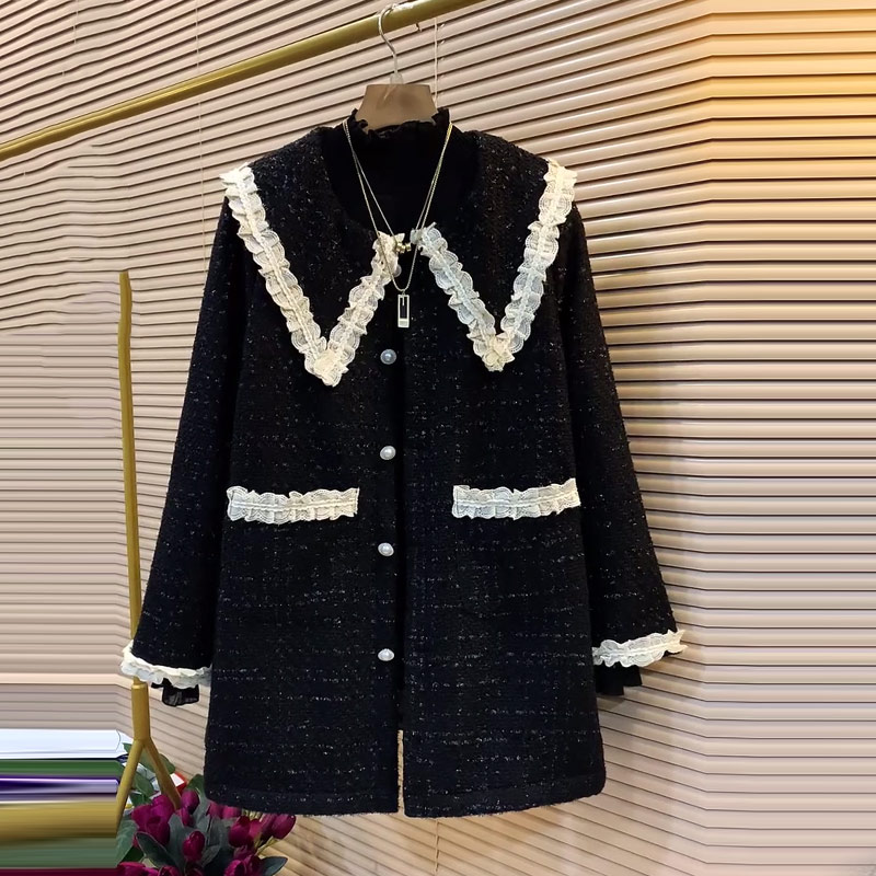 大码女装娃娃领拼色蕾丝边中长款小香风外套胖妹妹时尚秋季款上衣
