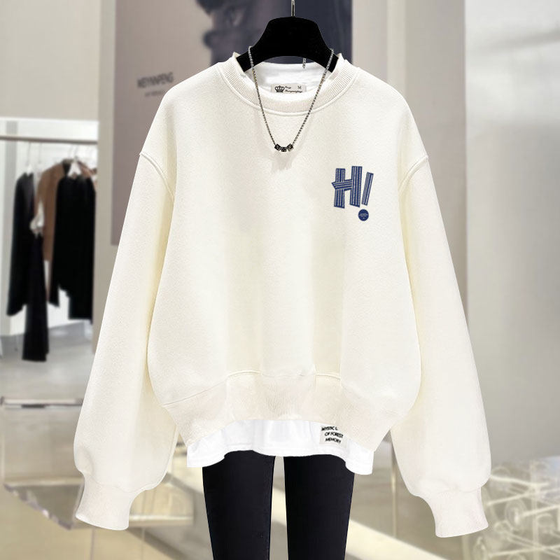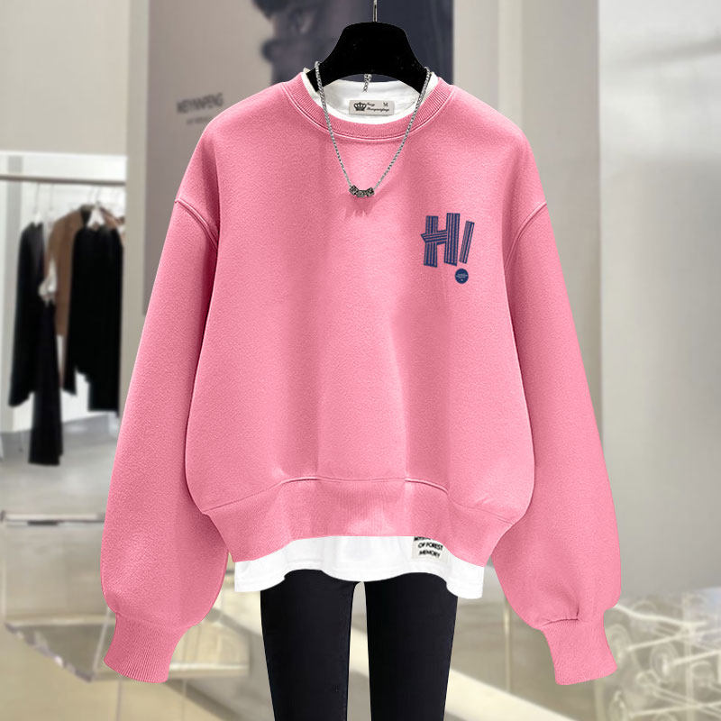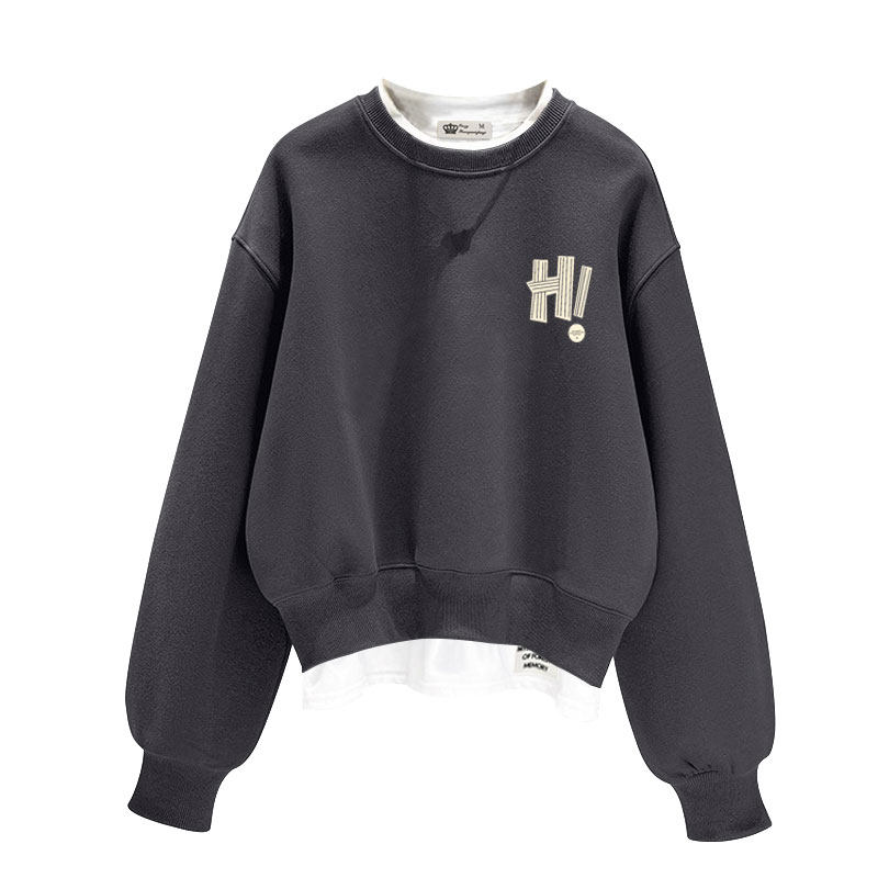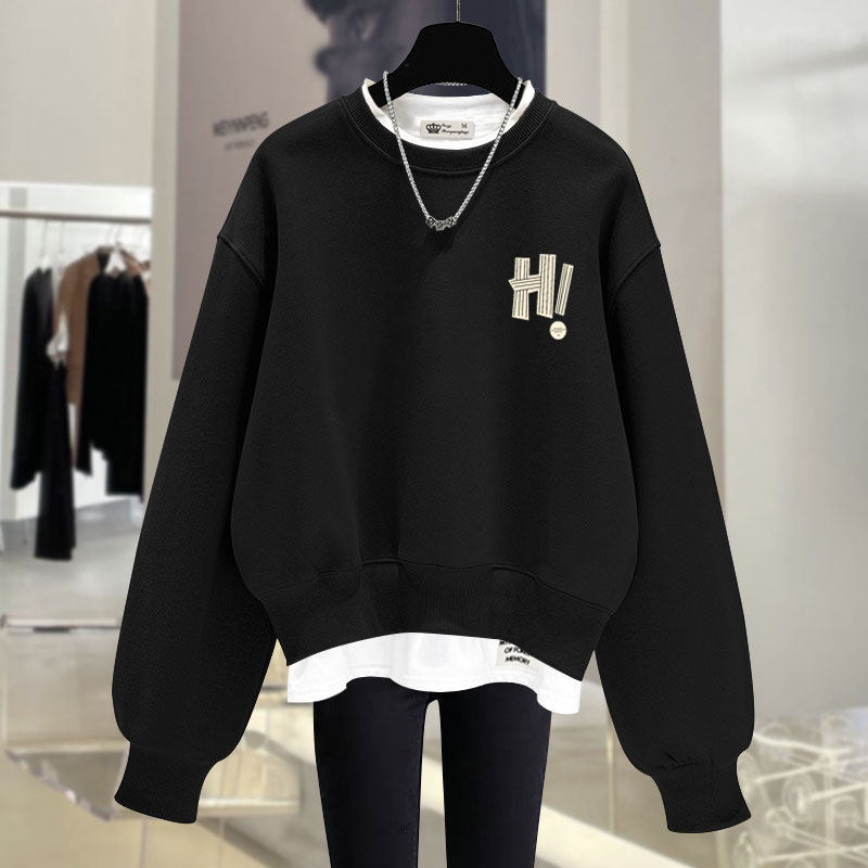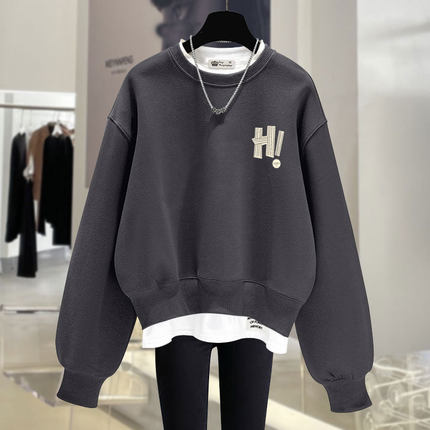 假两件卫衣女加绒2025新款春秋冬薄款条纹小字母灰色宽松圆领上衣