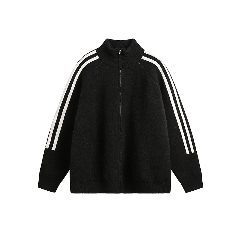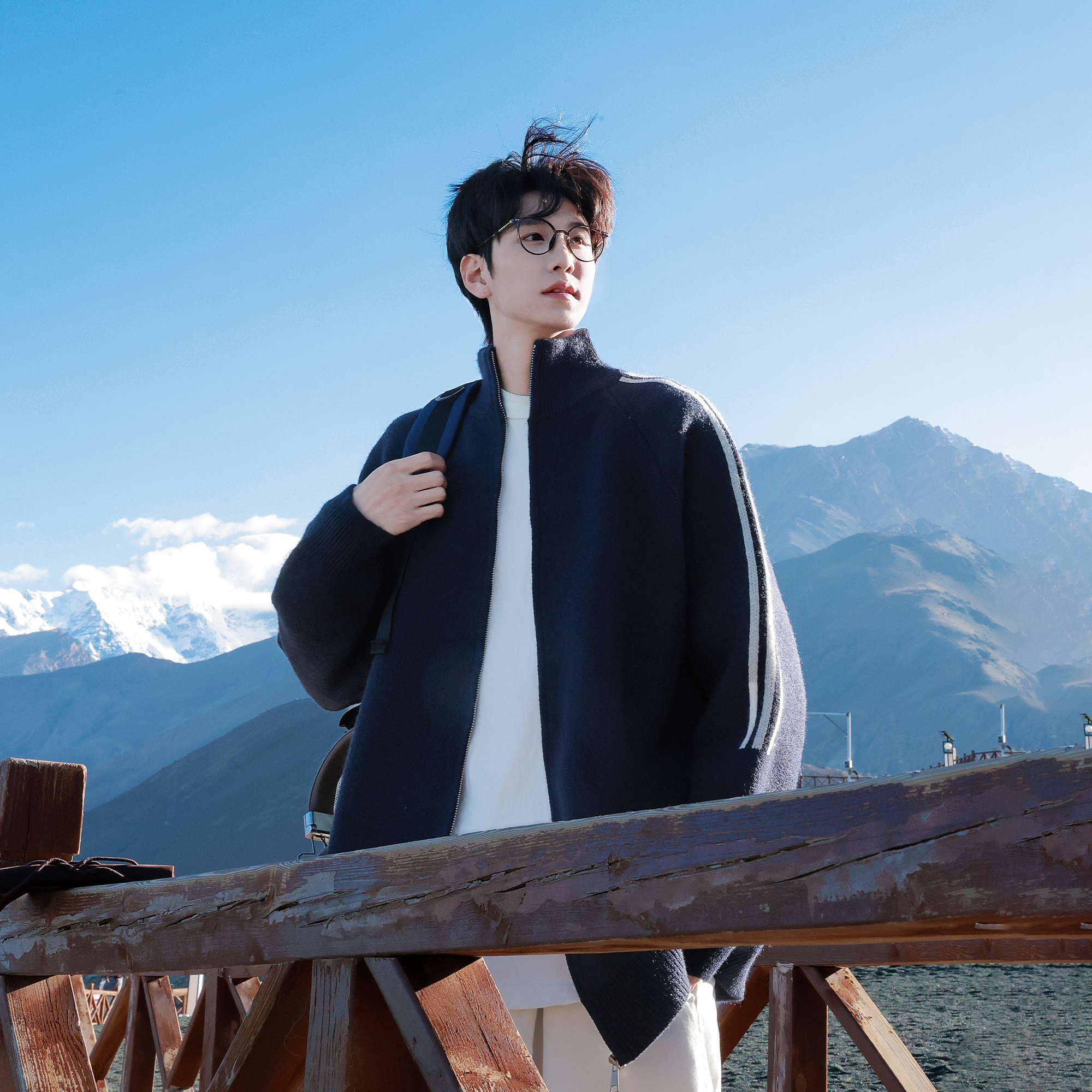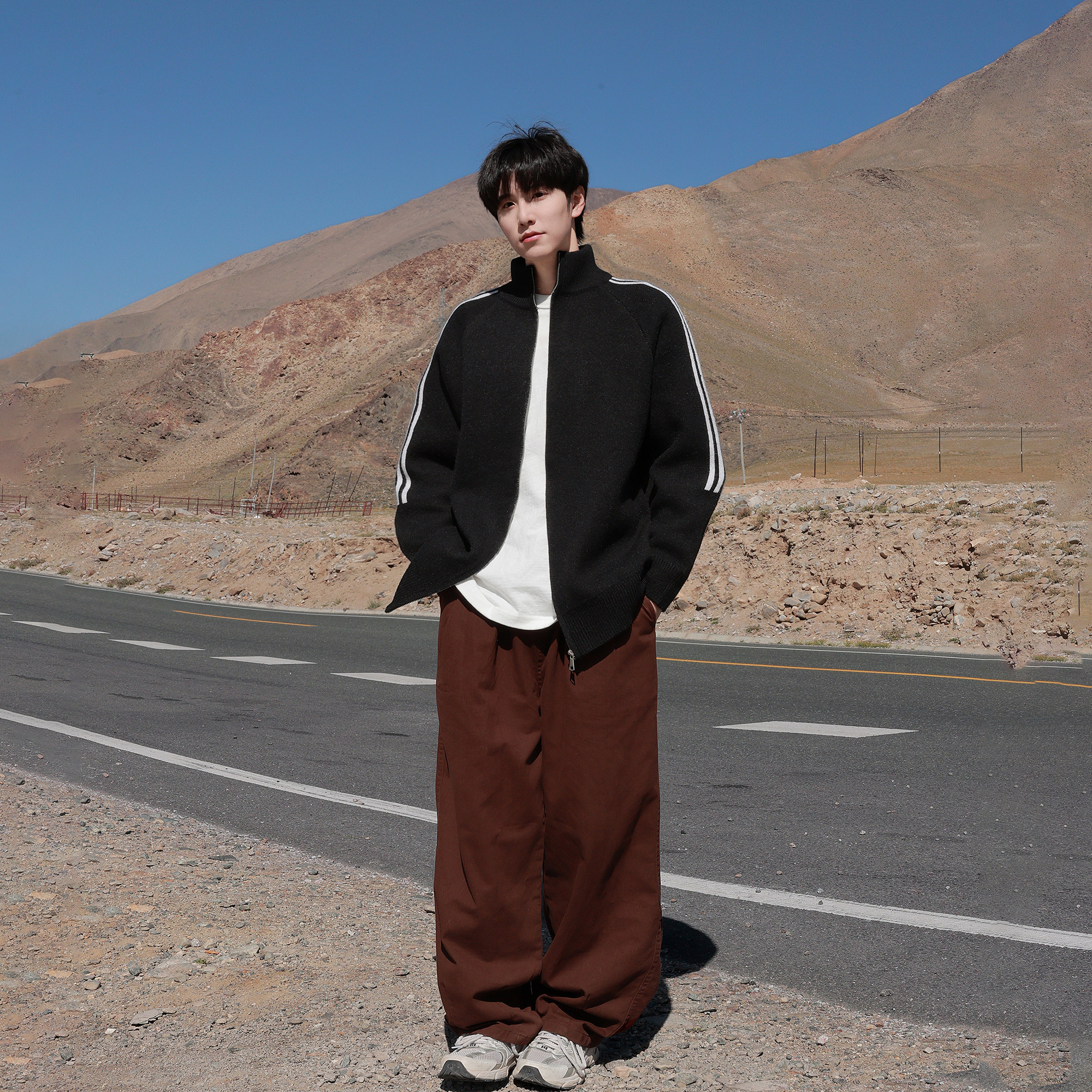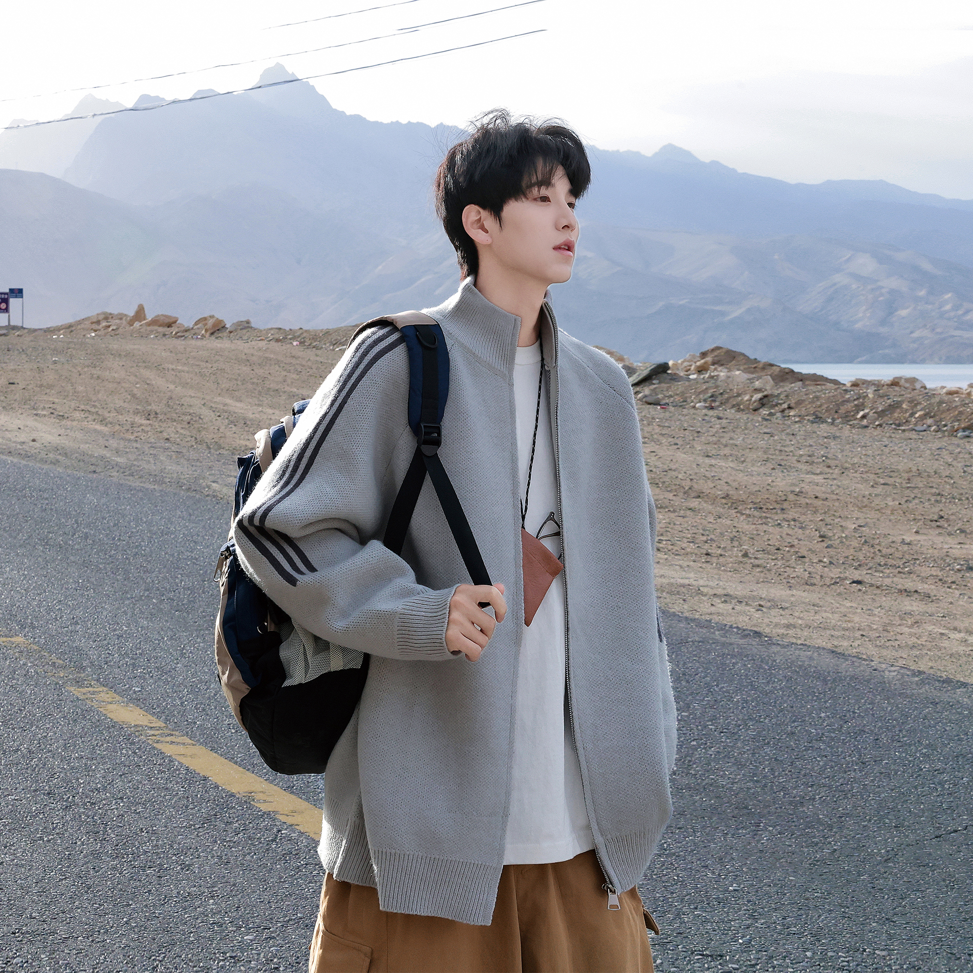 @港仔文艺男 日系编织高领开衫毛衣男秋冬条纹宽松男生针织衫外套