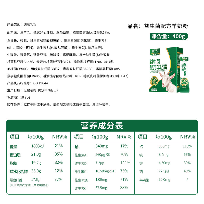 牧羊人益生菌配方羊奶粉高钙高蛋白脱膻儿童中老年人全家营养奶粉
