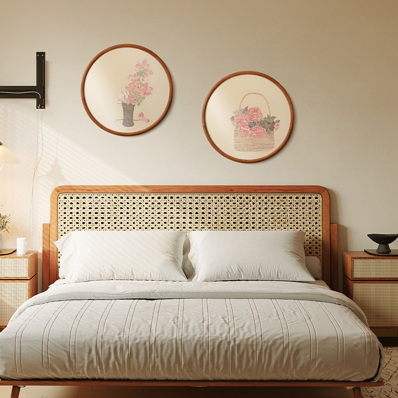 奶油风荷花玫瑰i花蓝圆形装饰画极简高级法式中国风客厅卧室装饰