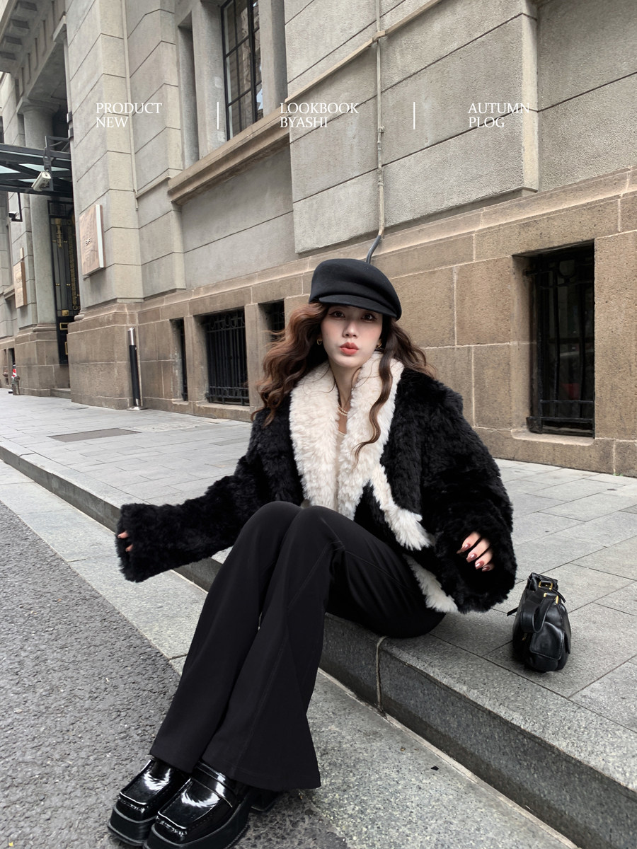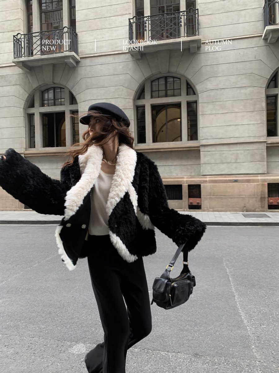 大于诗集V字翻领撞色环保皮草女小个子短款皮毛一体加厚外套冬季