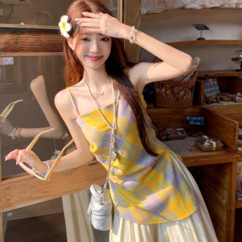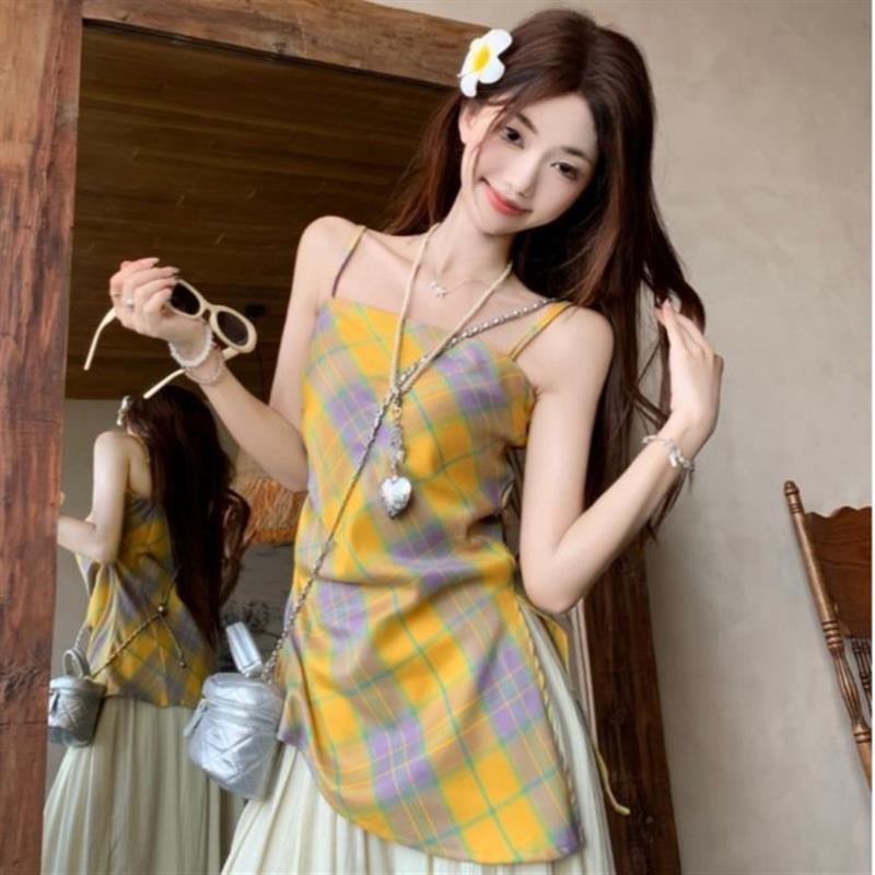 法式甜美黄色格子吊带背心女款夏季气质外穿收腰修身开叉无袖上衣