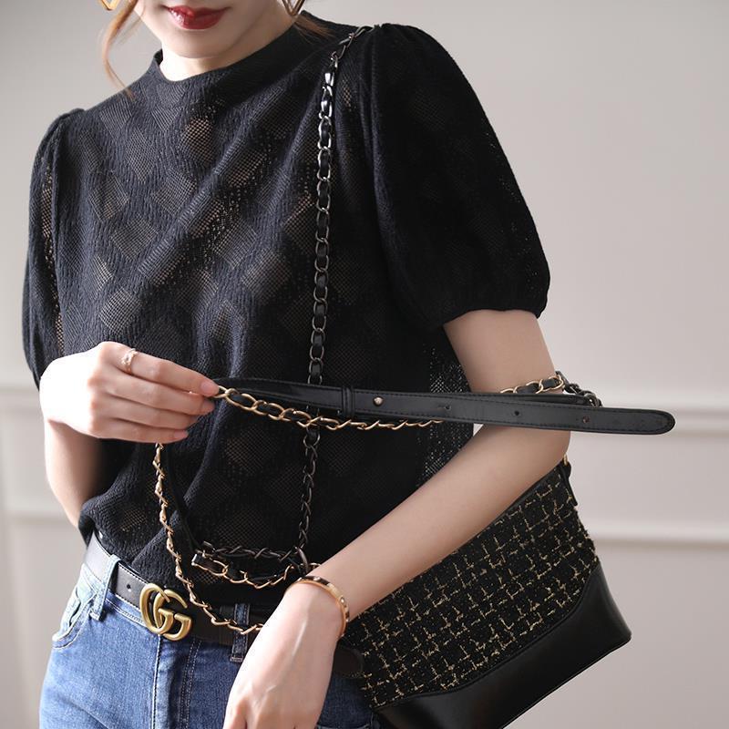 黑色t恤女设计感法式泡泡袖复古薄款镂空针织短袖上衣女夏季