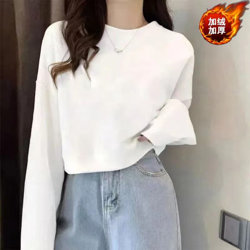 加绒加厚短款女卫衣高腰秋冬保暖圆领上衣长袖纯棉面宽松冬季外套