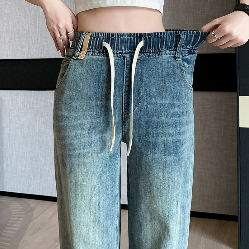 做旧阔腿牛仔裤女春夏新款系绳松紧腰学生宽松直筒窄版拖地加长裤