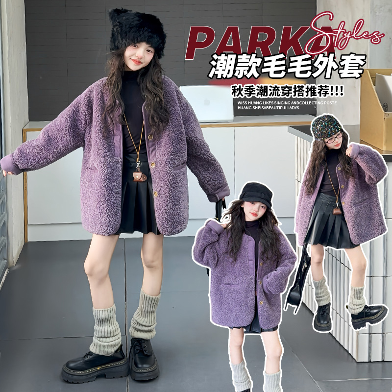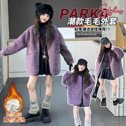 女童毛毛衣外套秋冬2024新款中大童洋气加厚外套羊羔绒冬网红上衣