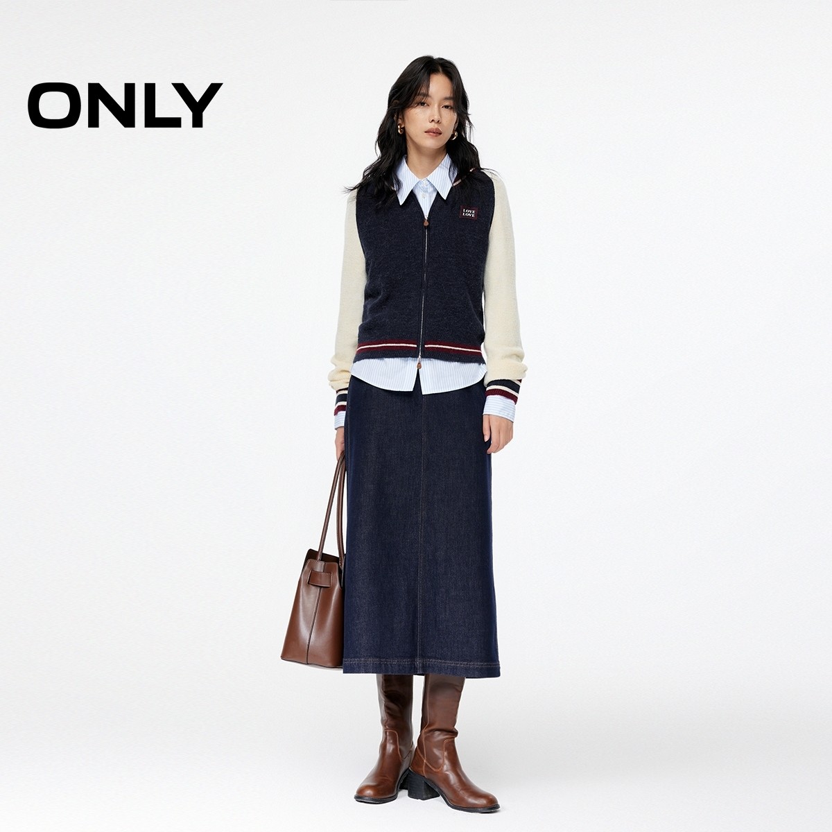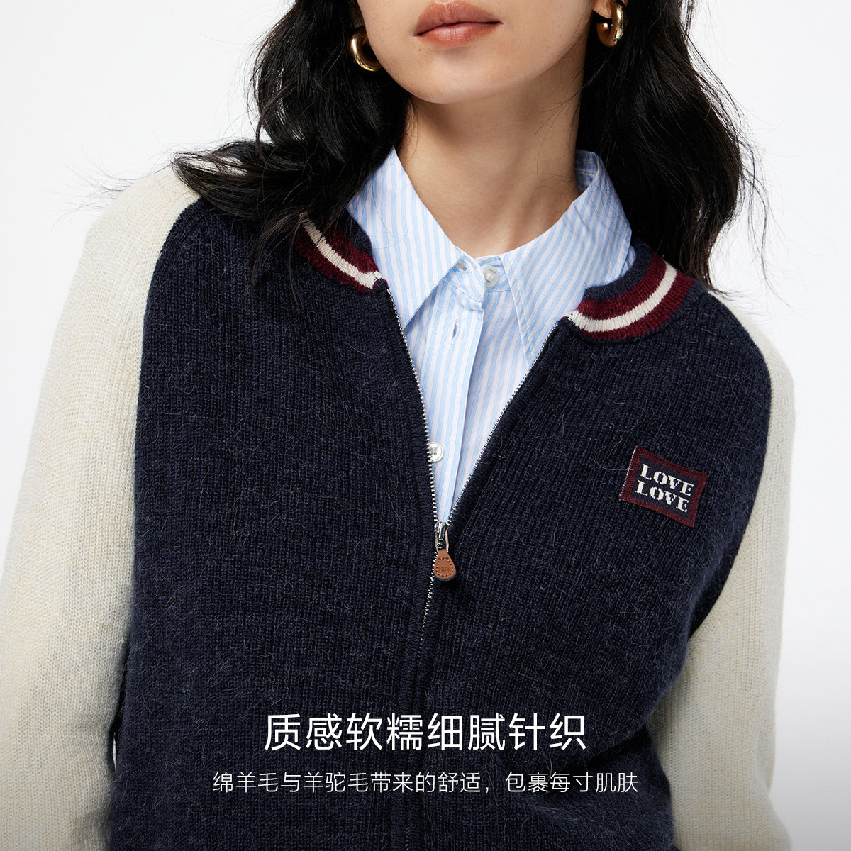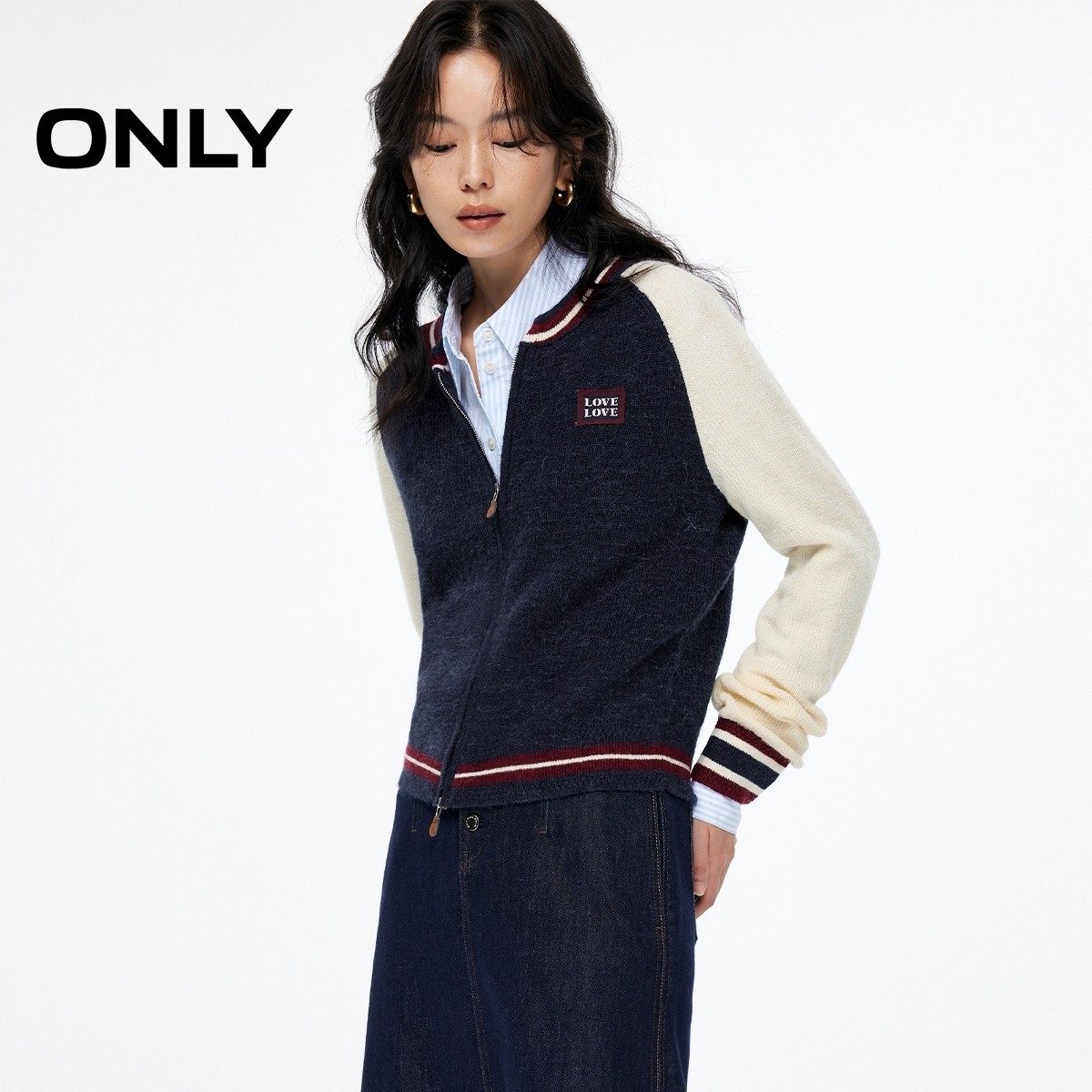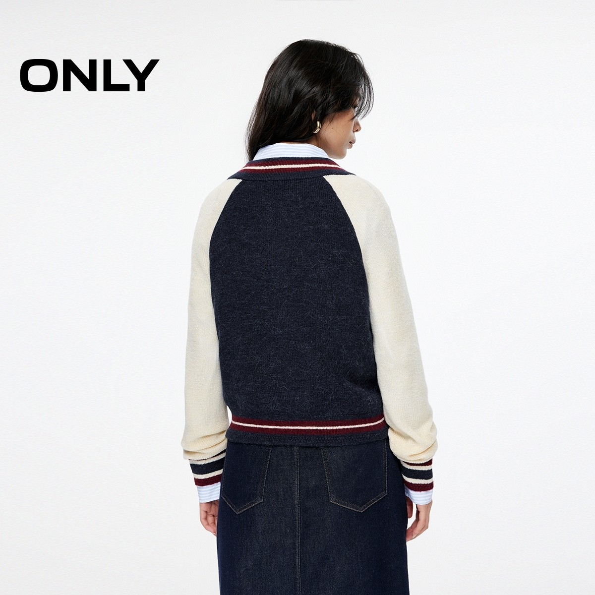 ONLY2025冬季新款学院风撞色设计含羊毛插肩圆领毛衣针织衫女