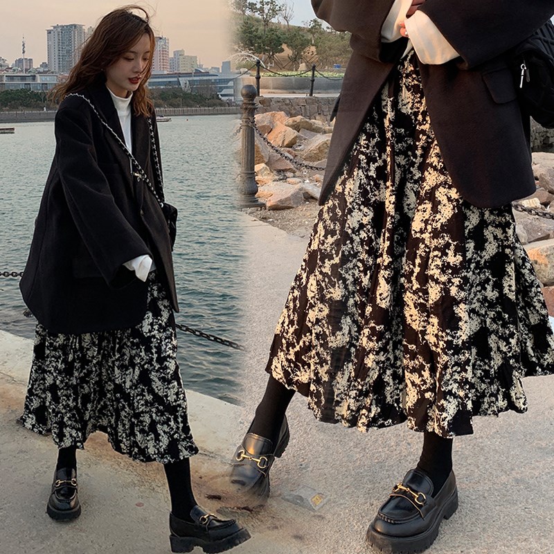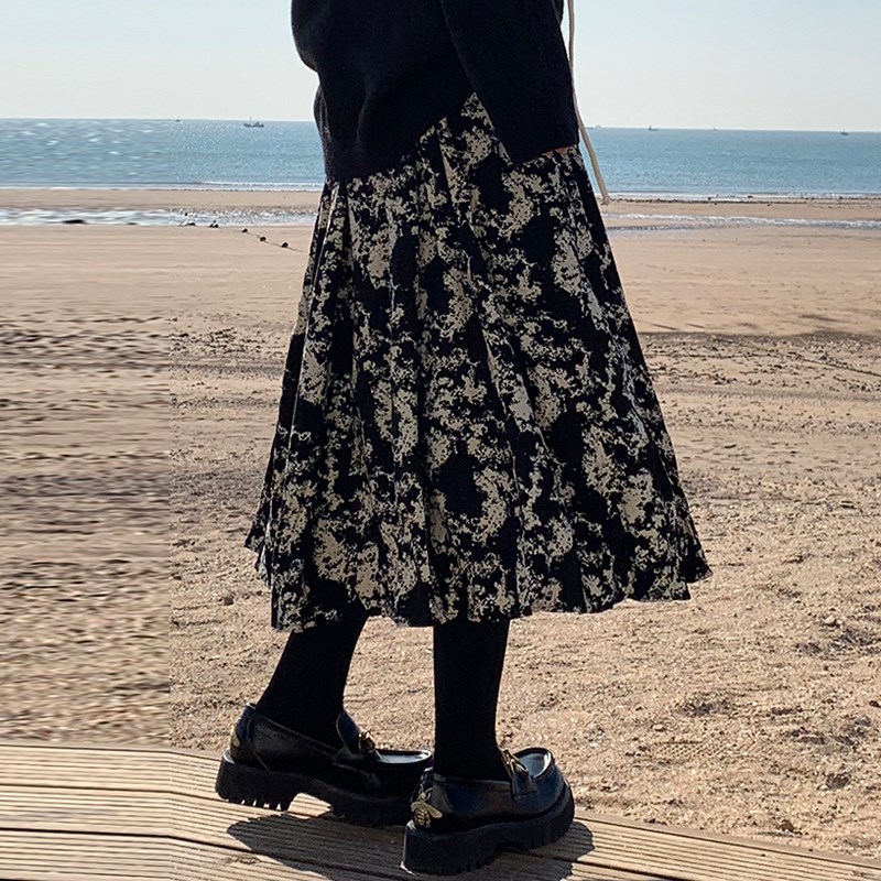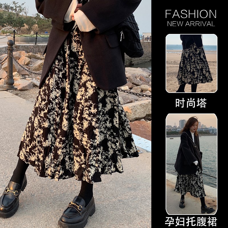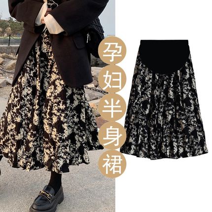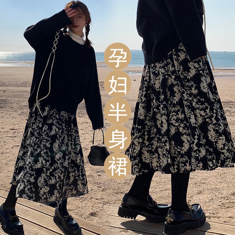 大码孕妇半身裙g春秋外穿黑色碎花裙百搭托腹高腰中长款长裙200斤