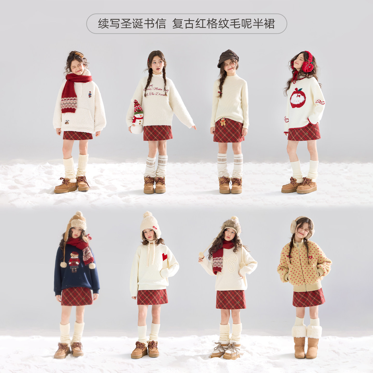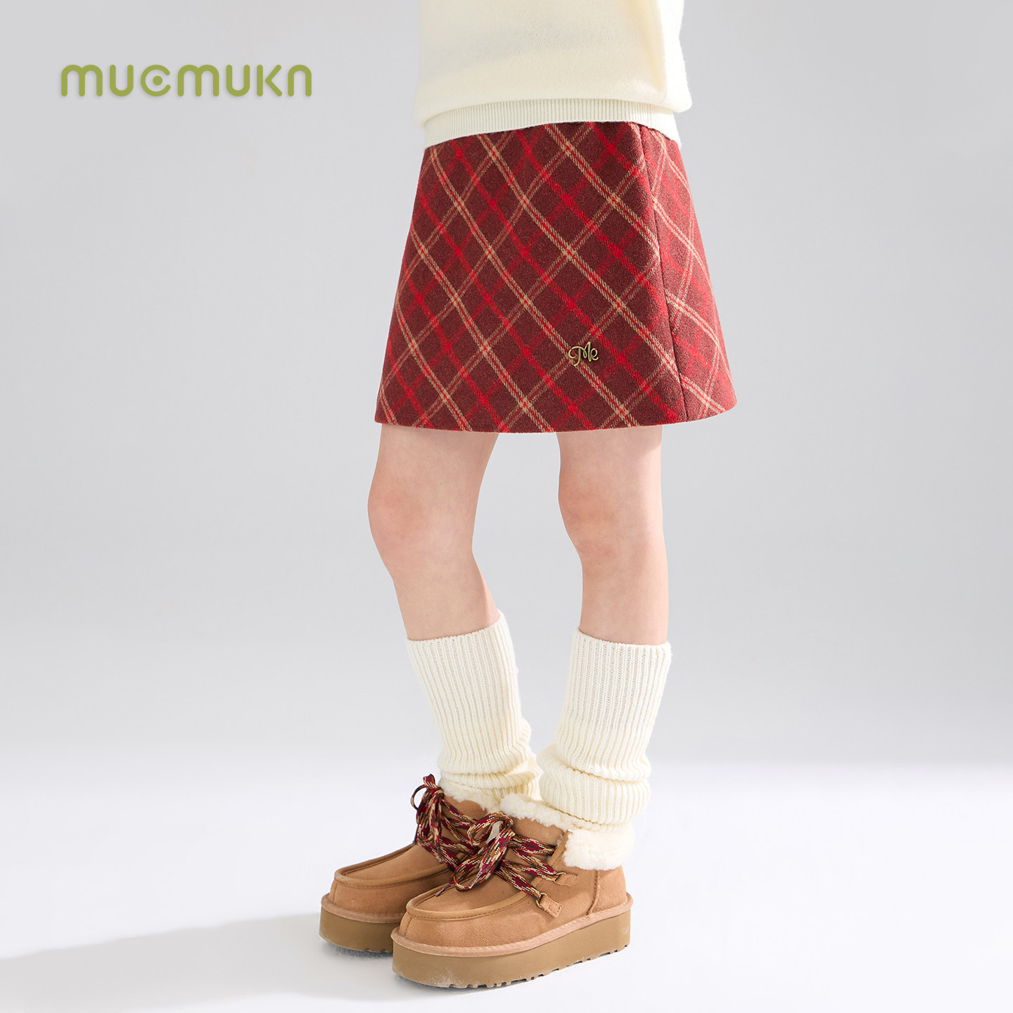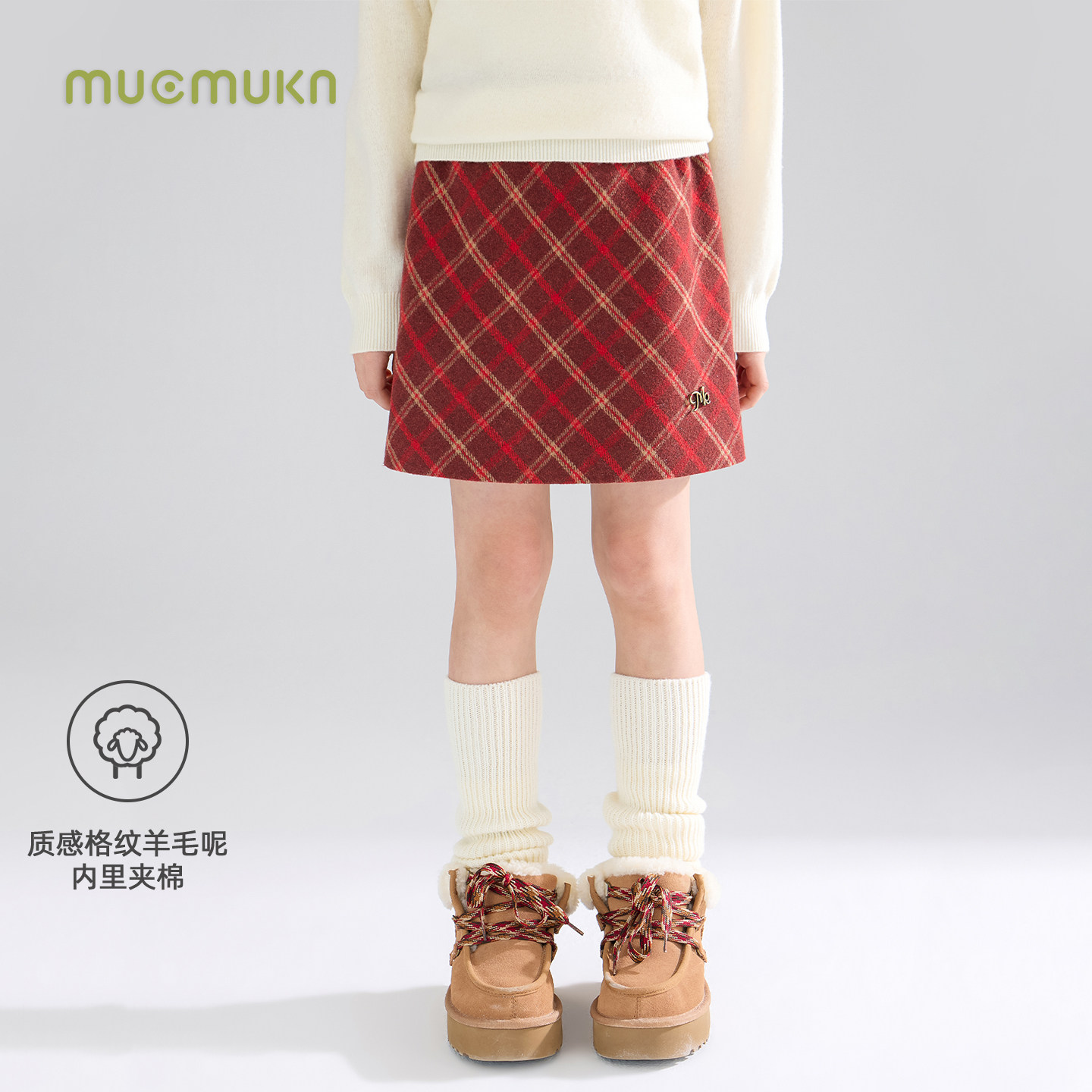 MUCMUKN【新年红格颂】复古红格纹羊毛呢腰裙夹棉裙子女童冬新款